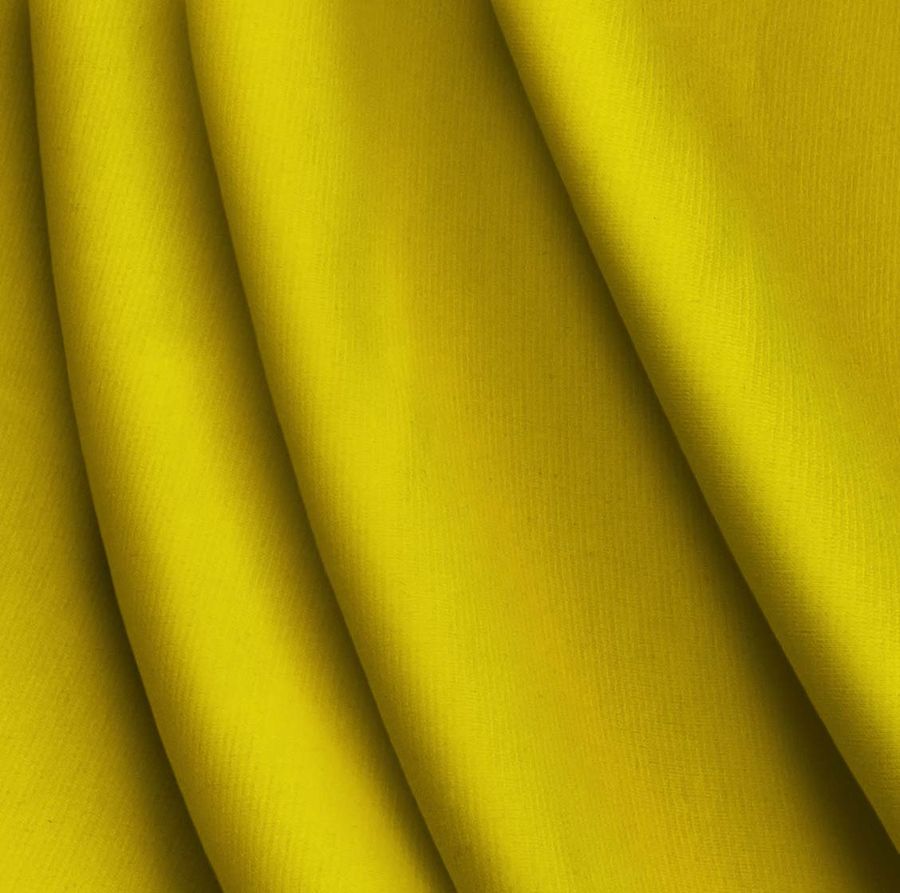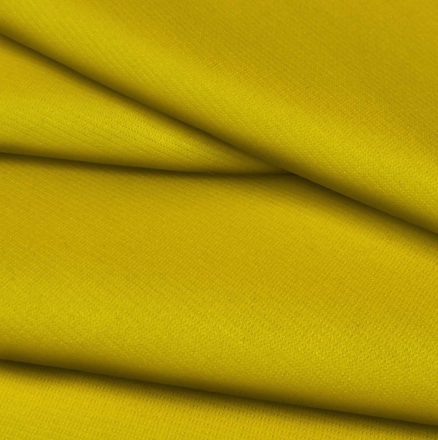 La tela base de este tejido es Punto Roma Elástico - Lyon, una tela de punto compuesta por 97% poliéster y 3% elastano. Su gramaje es de 282 gr/m2 y su ancho de 150 cm. En cuanto a su color liso impreso, se trata de un amarillo oro brillante obtenido a través de la tecnología de impresión por sublimación, con un CMYK de 15, 25, 97, 3. Este color transmite alegría y vitalidad, evocando la luz y el sol. Combina especialmente bien con tonos marrones y beige, así como también con el blanco y el negro. Es importante destacar que el tejido está impreso con el color liso a una sola cara por impresión digital textil.