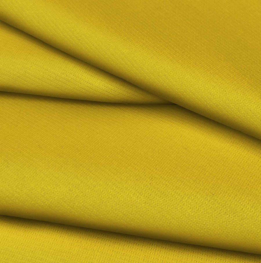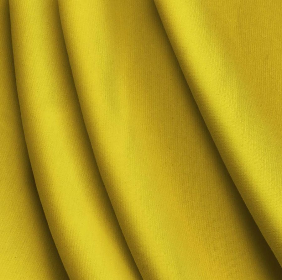 La tela base es Punto Roma Elástico - Lyon, una tela de punto compuesta por 97% poliéster y 3% elastano, con un gramaje de 282 gr/m2 y un ancho de 150 cm. Presenta un tono amarillo-oro naranja en la impresión lisa, con un CMYK de 9 25 91 1. El color secundario aporta una vibrante sensación de alegría y luz, evocando el calor del sol y la vitalidad de las flores. Combinado con tonos pasionales como el rojo o el fucsia, crea un contraste visualmente impactante. La tela está impresa a una sola cara por impresión digital textil.
