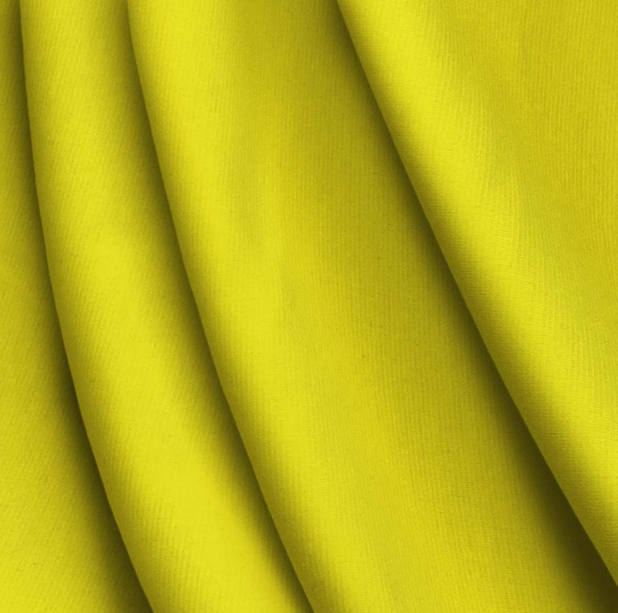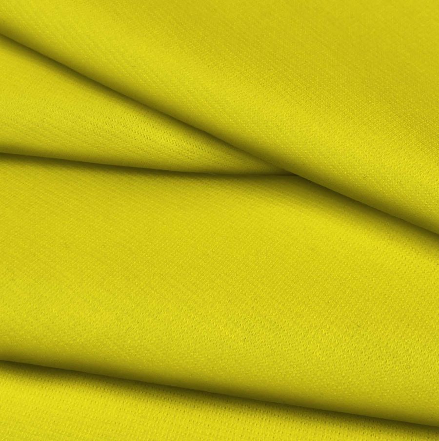La tela base es el Punto Roma Elástico - Lyon, una tela de punto compuesta por un 97% de poliéster y un 3% de elastano con un gramaje de 282 gr/m2 y un ancho de 150 cm. El color liso impreso es un amarillo canario con un CMYK de 6 0 89 0. Este color secundario simboliza el sol y la alegría, y técnicamente es un color cálido y vibrante que combina especialmente bien con colores como el blanco, el negro, el gris y el azul oscuro.