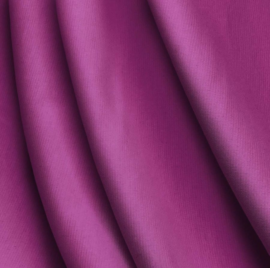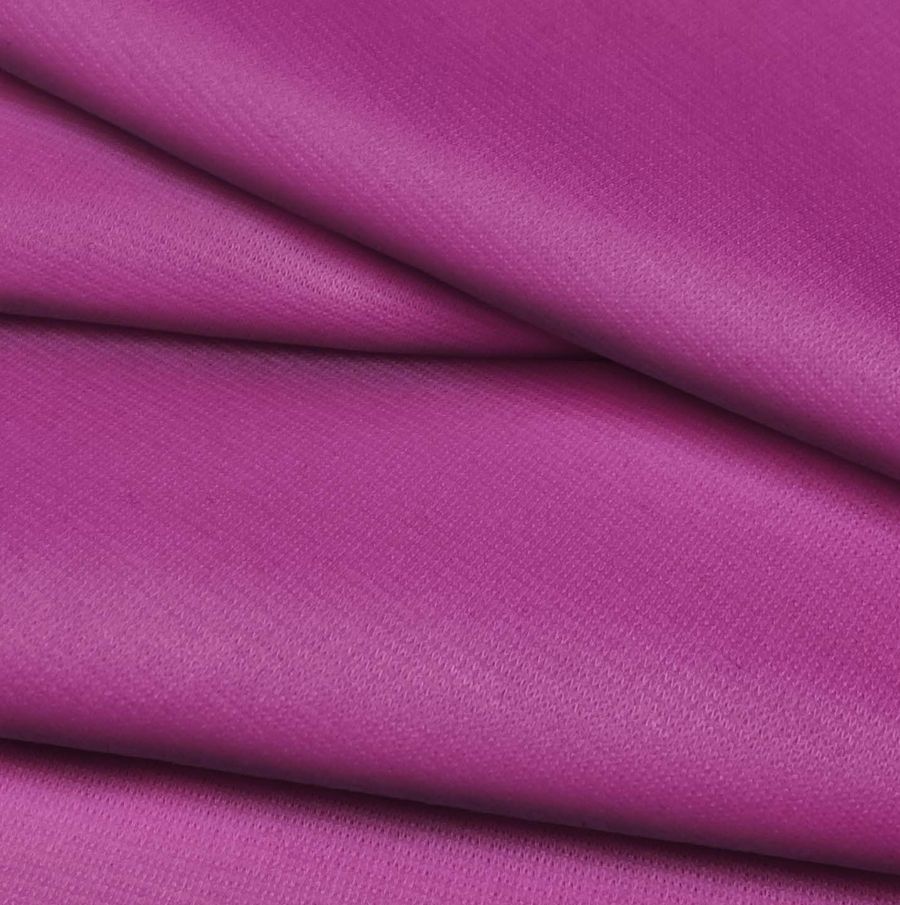 La tela base es Punto Roma Elástico - Lyon, una tela de punto compuesta por 97% POLIÉSTER y 3% ELASTANO. Su gramaje es de 282 gr/m2 y tiene un ancho de 150 cm. El color liso impreso es morado-ciruela rosa con un CMYK de 38 87 2 0, lo que indica una alta cantidad de tinta magenta y una baja cantidad de tinta amarilla. Este color simboliza la tranquilidad y el equilibrio entre lo masculino y lo femenino.