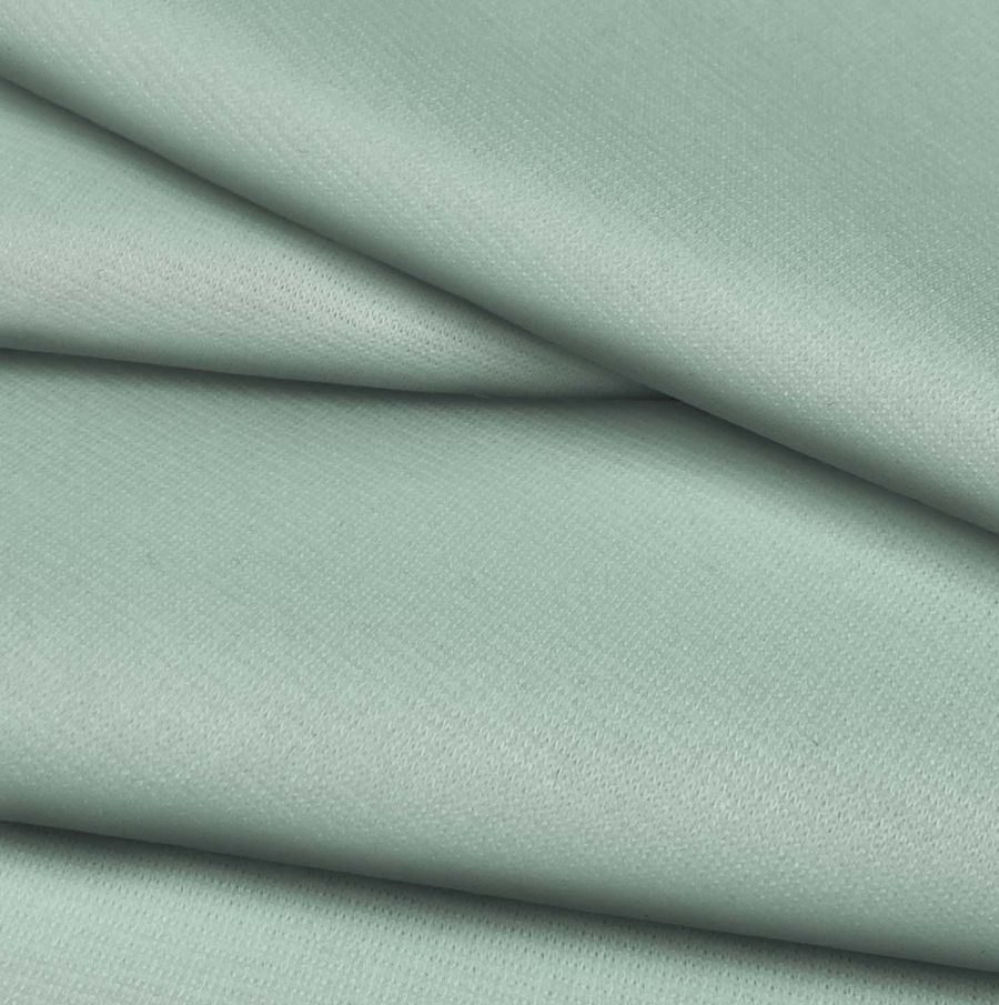 La tela base es el Punto Roma Elástico - Lyon, una tela de punto compuesta por 97% poliéster y 3% elastano, con un gramaje de 282 gr/m2 y de ancho 150 cm. Su color liso impreso es un verde-azul, con un contenido del CMYK de 37 6 29 0. Este color combina bien con otros tonos de verde y azul, creando una sensación de frescura y armonía.