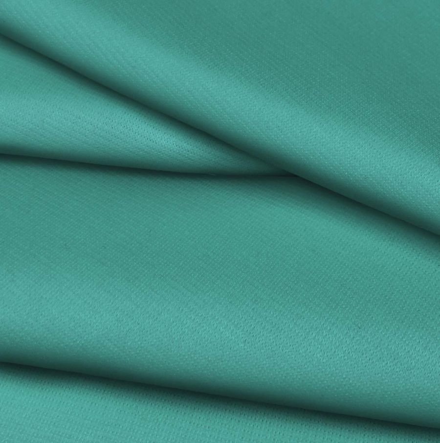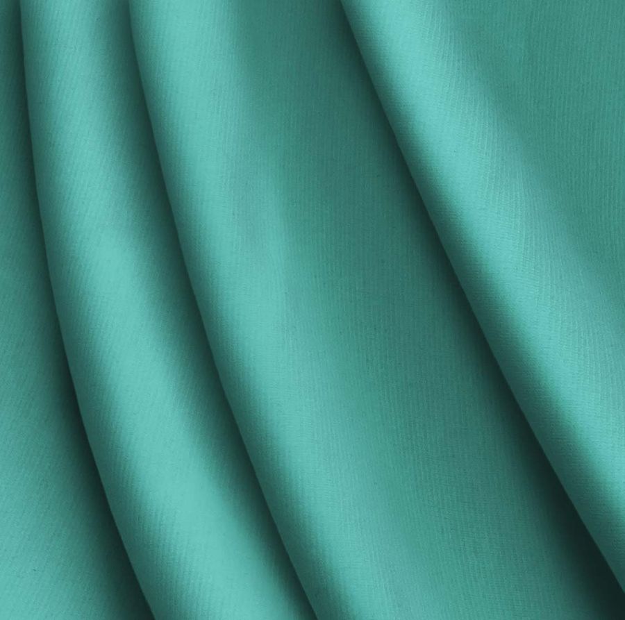 La tela base es el Punto Roma Elástico - Lyon, una tela de punto compuesta por un 97% de poliéster y un 3% de elastano, con un gramaje de 282 gr/m2 y un ancho de 150 cm. Su color liso impreso es un tono de verde conocido como Espuma de mar verde, que se crea a partir del CMYK 71 15 47 2. Este color secundario tiene un significado simbólico que evoca la tranquilidad, la naturaleza y la serenidad. Se combina bien con otros colores de la misma gama, como el blanco, el gris y el rosa claro. Es importante señalar que la tela está impresa con el color liso a una sola cara por impresión digital textil, lo que significa que el color no ha penetrado completamente la tela, sino que se ha adherido a la superficie.