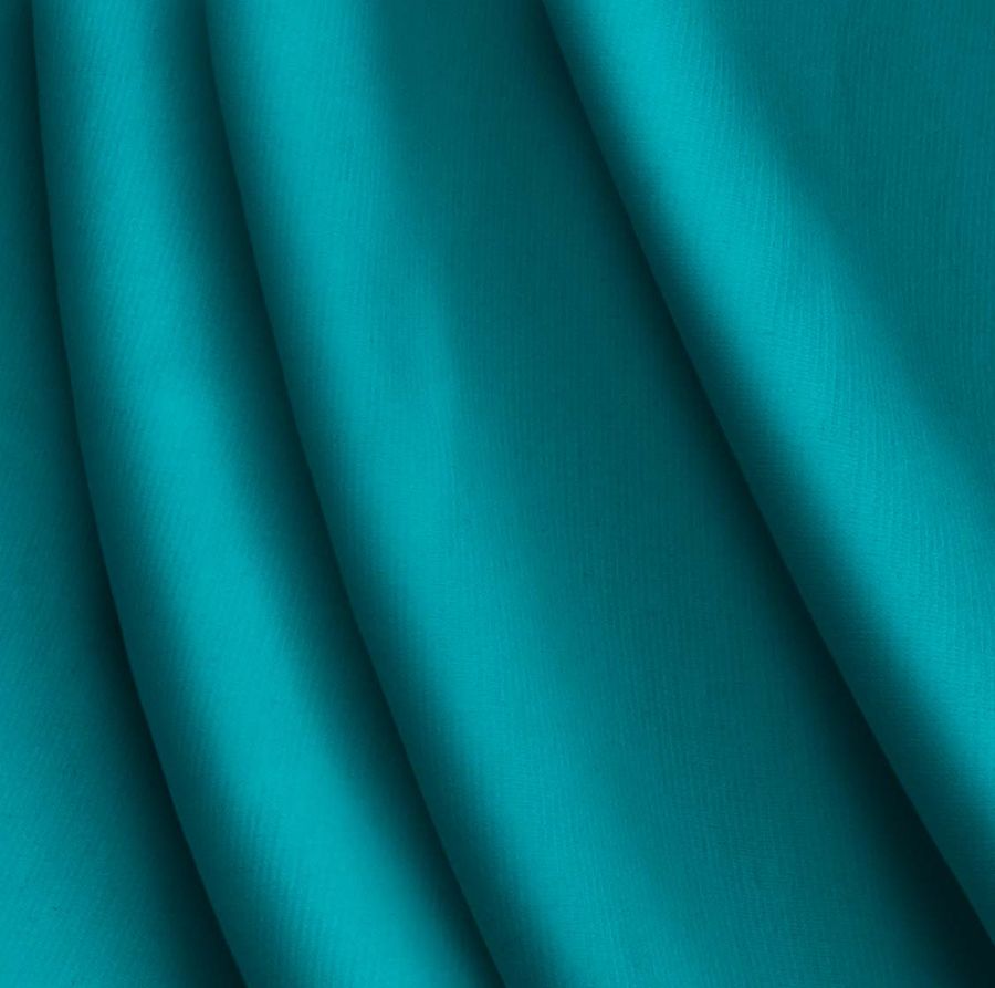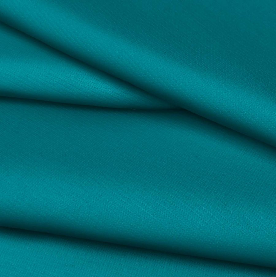 La tela base es Punto Roma Elástico - Lyon, una tela de punto compuesta en un 97% de poliéster y un 3% de elastano, con un gramaje de 282 gr/m2 y un ancho de 150 cm. Su color liso impreso es un verde azulado con un CMYK de 85 31 42 17. Este color se asemeja a la coloración de la turquesa, y su simbolismo se asocia con la creatividad, la intuición y la comunicación emocional. La mezcla de un verde claro y un azul oscuro produce la impresión de serenidad y tranquilidad en el espectador. Este color combina bien con tonos similares como el agua marina y la menta, así como con colores más intensos como el rojo y el naranja.