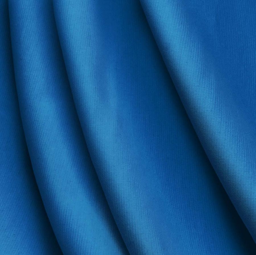La tela base es el Punto Roma Elástico - Lyon, una tela de punto compuesta por un 97% de poliéster y un 3% de elastano, con un gramaje de 282 gr/m2 y un ancho de 150 cm. El color liso impreso es un Azul Marino Brillante con una composición de 88 en tinta Cyan, 51 en tinta Magenta, 2 en tinta Yellow y 0 en tinta Black, lo que se traduce a un CMYK de 88 51 2 0. Este color transmite serenidad, elegancia y sofisticación, y nos recuerda al mar profundo.