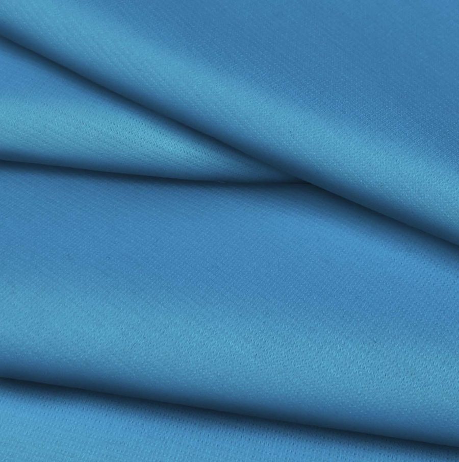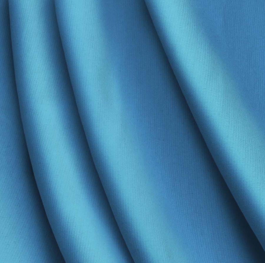 La tela base es Punto Roma Elástico - Lyon, una tela de punto compuesta por 97% poliéster y 3% elastano, con un gramaje de 282 gr/m2 y ancho de 150 cm. El color liso impreso en esta tela es Azul seda, con tinta Cyan: 72, Magenta: 34, Yellow: 2 y Black: 0, formando un CMYK de 72 34 2 0. Este tono azul ofrece una sensación suave y fresca, como la seda, simbolizando la tranquilidad y el equilibrio en la paleta de colores. Además, se puede combinar de manera excelente con tonos neutros como el blanco y el gris, así como con colores más brillantes como el amarillo, el naranja y el rosa.