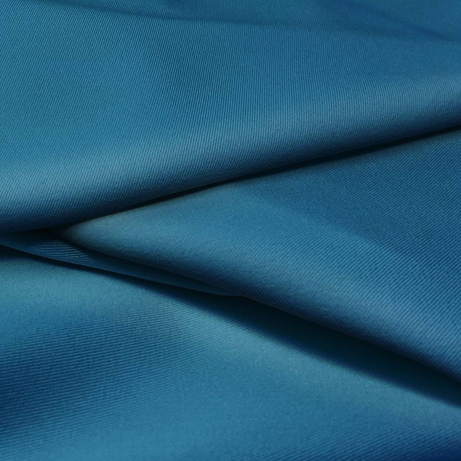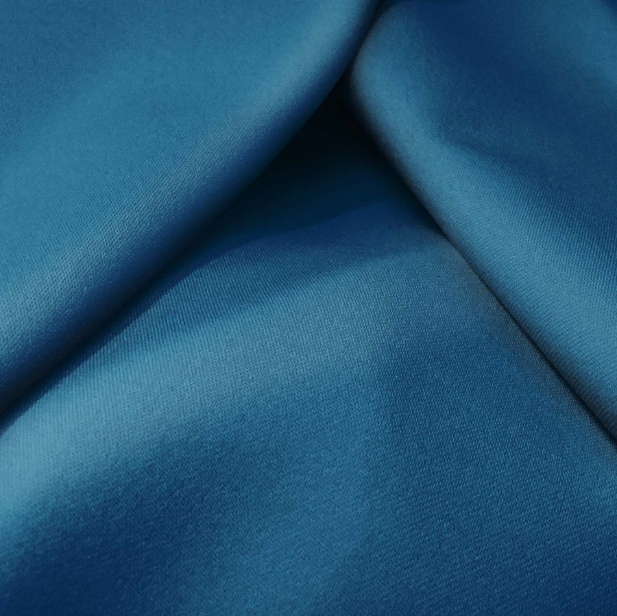 La tela base, Sarga Bielástica - Lisboa, está compuesta por un 97% de poliéster y un 3% de elastano, lo que la convierte en una tela elástica y resistente con un gramaje de 209 gr/m2 y un ancho de 150 cm. El color liso impreso, Arrendajo Azul, se caracteriza por tener un CMYK de 98 67 35 24 y se combina especialmente bien con colores como blanco, gris y negro. La tela está impresa a una sola cara por impresión digital textil.
