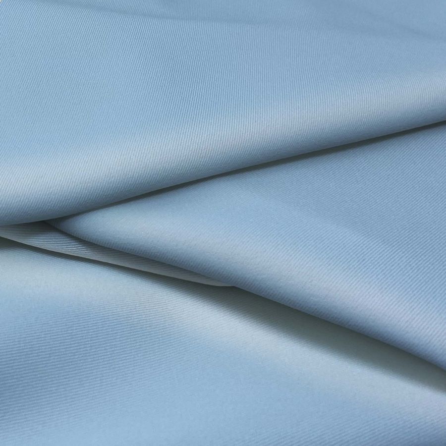La tela base, Sarga Bielástica - Lisboa, tiene una composición de 97% poliéster y 3% elastano, con un gramaje de 209 gr/m2 y un ancho de 150 cm. El color liso impreso es Azul seda, con un CMYK de 51 23 5 0. Este color, de tono azul suave y delicado, transmite calma, serenidad y elegancia, y combina especialmente bien con tonos blancos, cremas y grisáceos. Es importante destacar que la tela base está impresa con el color liso a una sola cara por impresión digital textil.