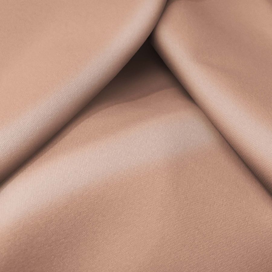 La tela base de este tejido es la Sarga Bielástica - Lisboa, compuesta por un 97% de poliéster y un 3% de elastano, con un gramaje de 209 gr/m2 y un ancho de 150 cm. El color liso impreso es una combinación de naranja y cobre claro, con un CMYK de 11 43 44 2. Este color representa una energía cálida y brillante que simboliza la renovación y la vitalidad. Combina especialmente bien con colores verdes y azules.