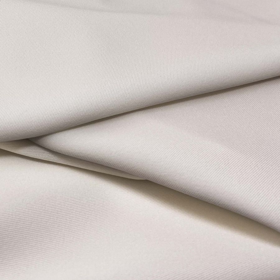 La tela base, llamada Sarga Bielástica-Lisboa, de composición 97% poliéster y 3% elastano, tiene un gramaje de 209 gr/m2. Su ancho es de 150 cm y se utiliza en aplicaciones de moda para pantalones, faldas, jeans, vestidos, shorts, bermudas, accesorios, así como en textiles para el hogar como paños, cojines, servilletas, cuadros y bastidores. Es una tela duradera y fácil de cuidar, con una temporada atemporal. El color liso impreso en este tejido es un blanco lino, con una combinación CMYK de 5 12 11 0, lo que se refiere a una tinta cian del 5%, magenta del 12%, amarilla del 11% y negra del 0%. Este color se define como un tono neutro, agradable al ojo humano y que combina perfectamente con una amplia variedad de colores secundarios como grises, beige y tonos terrosos. La tela se imprime a una sola cara por impresión digital textil, y no se tiñe sino que se imprime con los colores ya mencionados.