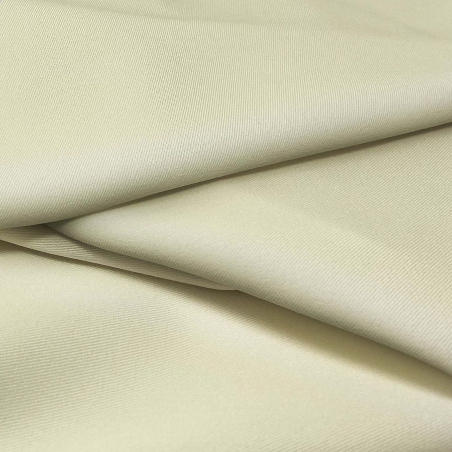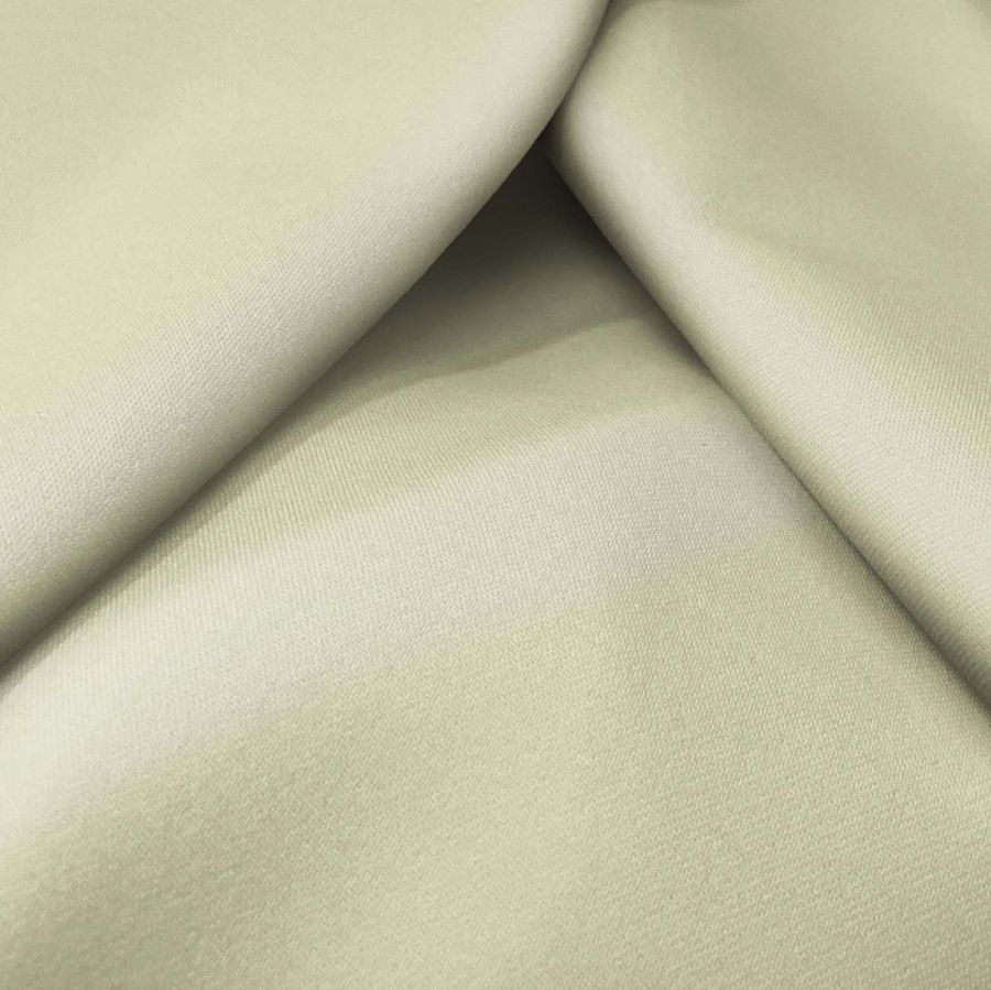 La tela base es la Sarga Bielástica - Lisboa, de composición 97% poliéster y 3% elastano, con un gramaje de 209 gr/m2 y ancho de 150 cm. El color liso impreso es un tono crudo/crema, con un CMYK de 8 4 34 0 que le da un aspecto suave y elegante. Este color combina perfectamente con tonos terracota, amarillo mostaza y verde oliva.