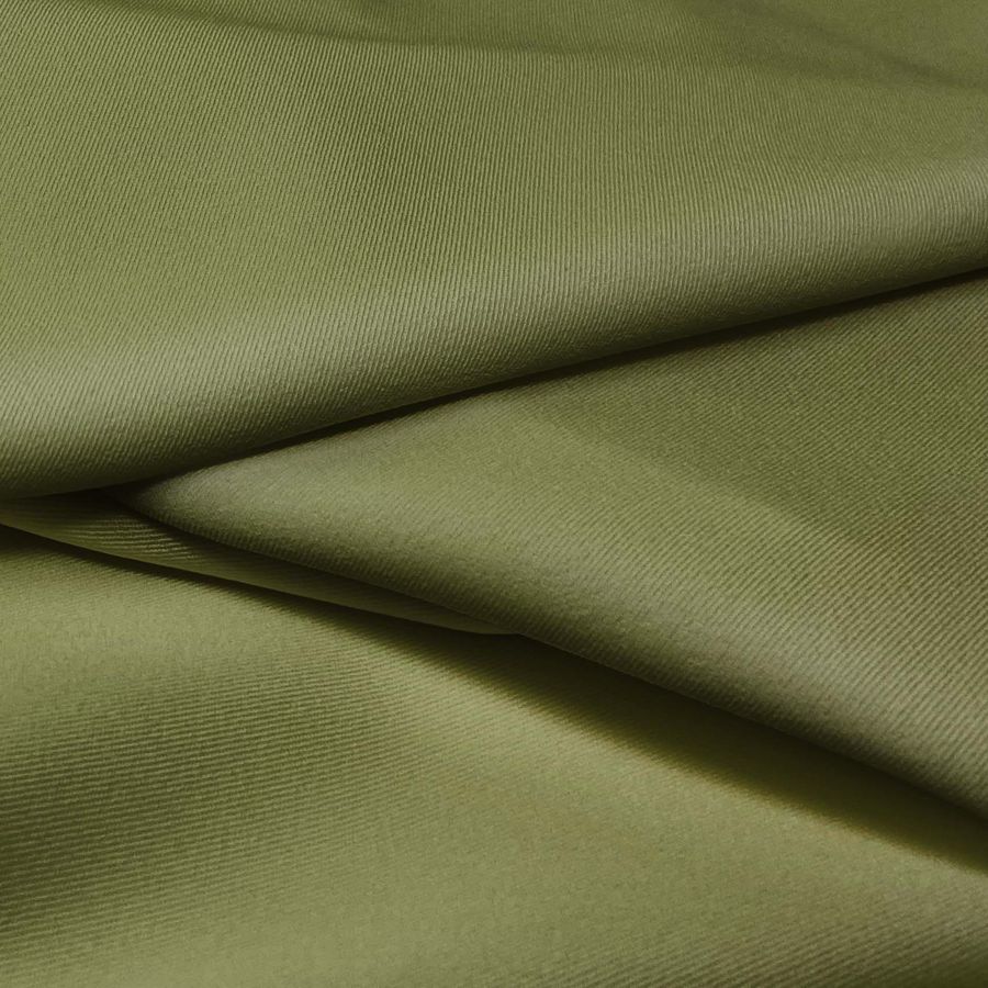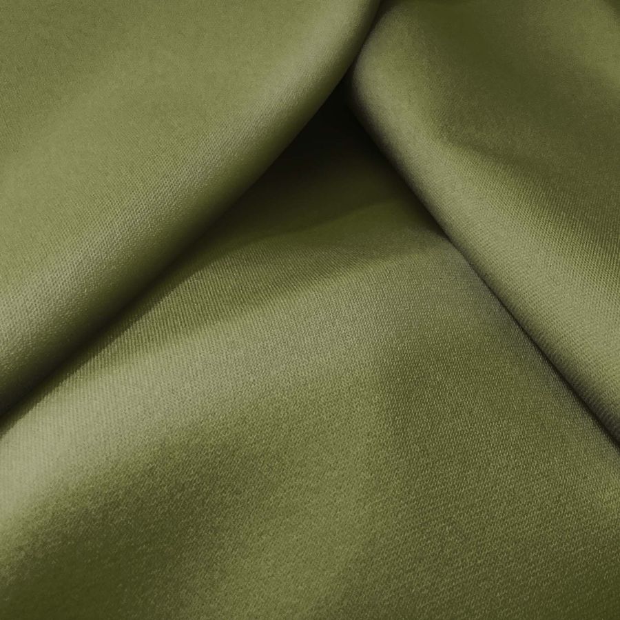 La tela base de este tejido es la Sarga Bielástica - Lisboa, compuesta en un 97% de poliéster y un 3% de elastano, lo que le otorga una textura suave, elástica y rugosa al tacto. El color liso impreso es un verde tierra, cuyo CMYK es de 61 45 88 41, lo que le da un tono cálido y natural. Combina especialmente bien con tonos beige, marrones y mostaza.