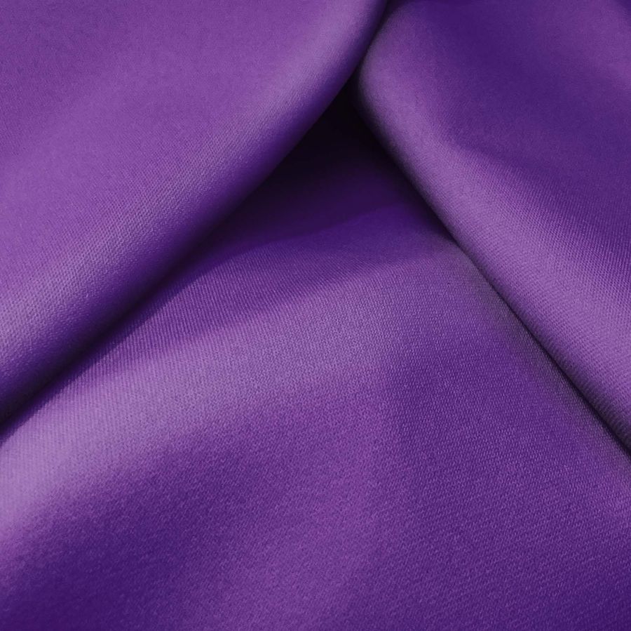 La tela base, Sarga Bielástica - Lisboa, está compuesta por un 97% de poliéster y un 3% de elastano, con un gramaje de 209 gr/m2 y un ancho de 150 cm. El color liso impreso en la tela tiene un CMYK de 82 100 11 3, y se compone de morado, índigo e iris morado, lo que crea un tono violeta intenso. Este color simboliza la inspiración, la espiritualidad y la magia. Además, combina perfectamente con tonos neutros como el negro, el antracita y el gris, así como con colores claros y brillantes como el blanco, el amarillo y el verde menta.