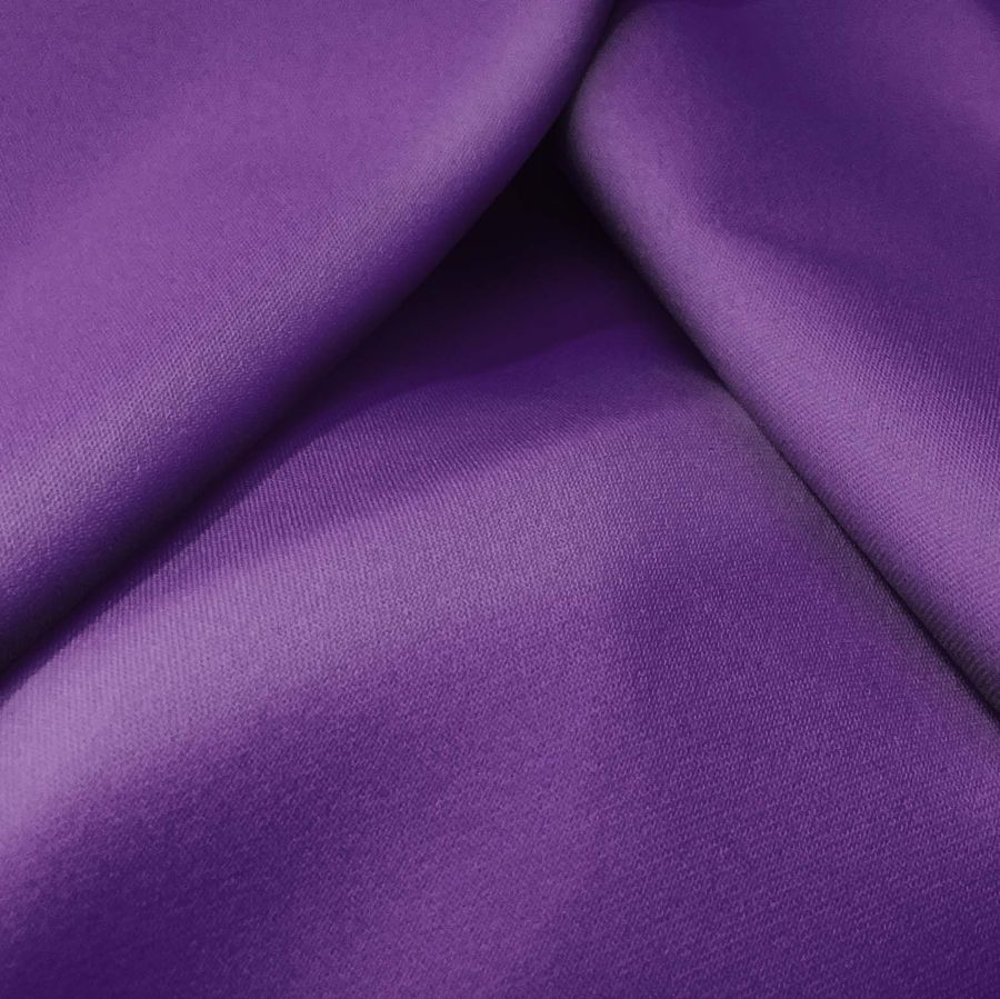 La tela base de esta prenda es la Sarga Bielástica - Lisboa, con una composición de 97% poliéster y 3% elastano, un gramaje de 209 gr/m2 y un ancho de 150 cm. El color liso impreso tiene un tono de morado iris con un CMYK de 82 100 19 7. Este color se caracteriza por tener una vibración suave y una personalidad misteriosa, siendo una excelente combinación de los colores azul y rojo. Además, este color secundario combina perfectamente con tonos fríos como el azul oscuro y el gris, así como también con tonos cálidos como el amarillo o el dorado.