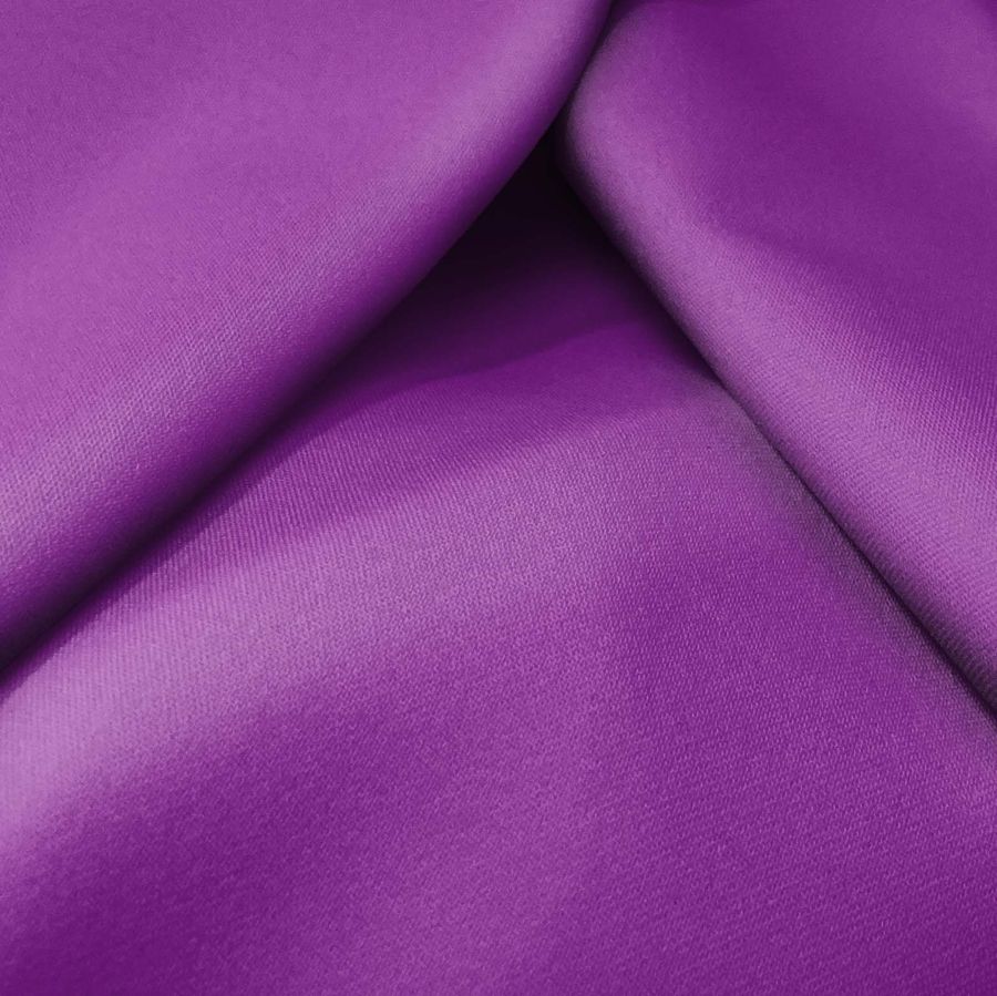 La tela base, Sarga Bielástica - Lisboa, está compuesta por un 97% de poliéster y un 3% de elastano, con un gramaje de 209 gr/m2 y una anchura de 150cm. El color liso impreso es un Morado Mermelada Púrpura, generado mediante el proceso de sublimación (POLIESTER), con un CMYK de 64 96 2 0. El color púrpura se relaciona con la creatividad, la nobleza y la sofisticación, ofreciendo sutileza y dulzura. Este color secundario se puede combinar con otros tonos pastel como rosa, amarillo o gris, así como también tonos intensos como verde, cobre y dorado.
