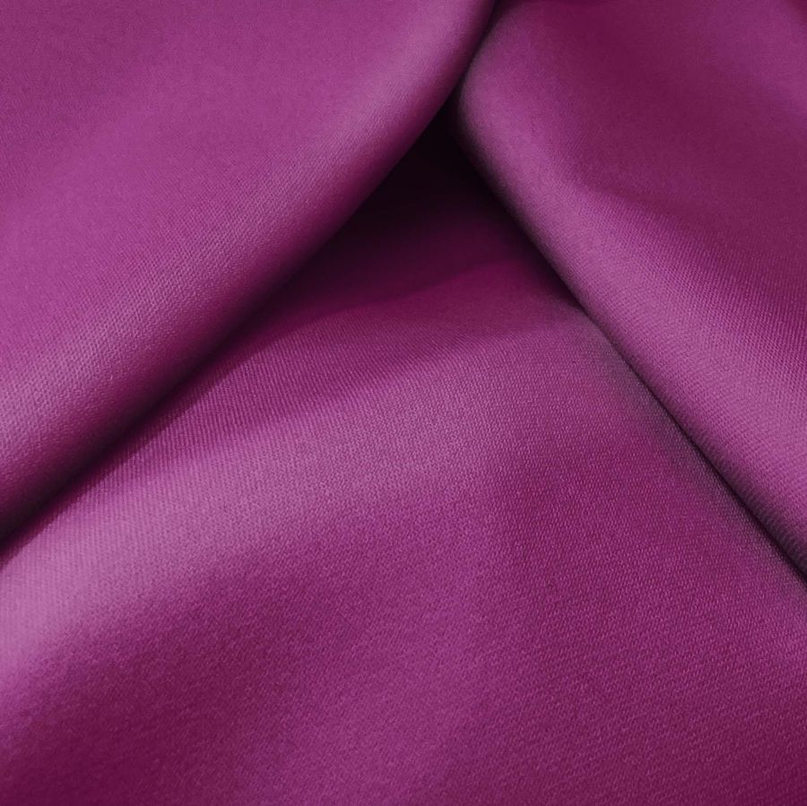 La tela base es la sarga bielástica Lisboa. El color liso impreso es de un intenso morado berenjena, con un CMYK de 55, 100, 25, 24. Este color evoca sentimientos de sensualidad, riqueza y elegancia. Combinado con otros colores como gris claro, dorado, naranja y rosa, puede lograr un aspecto sofisticado y moderno.