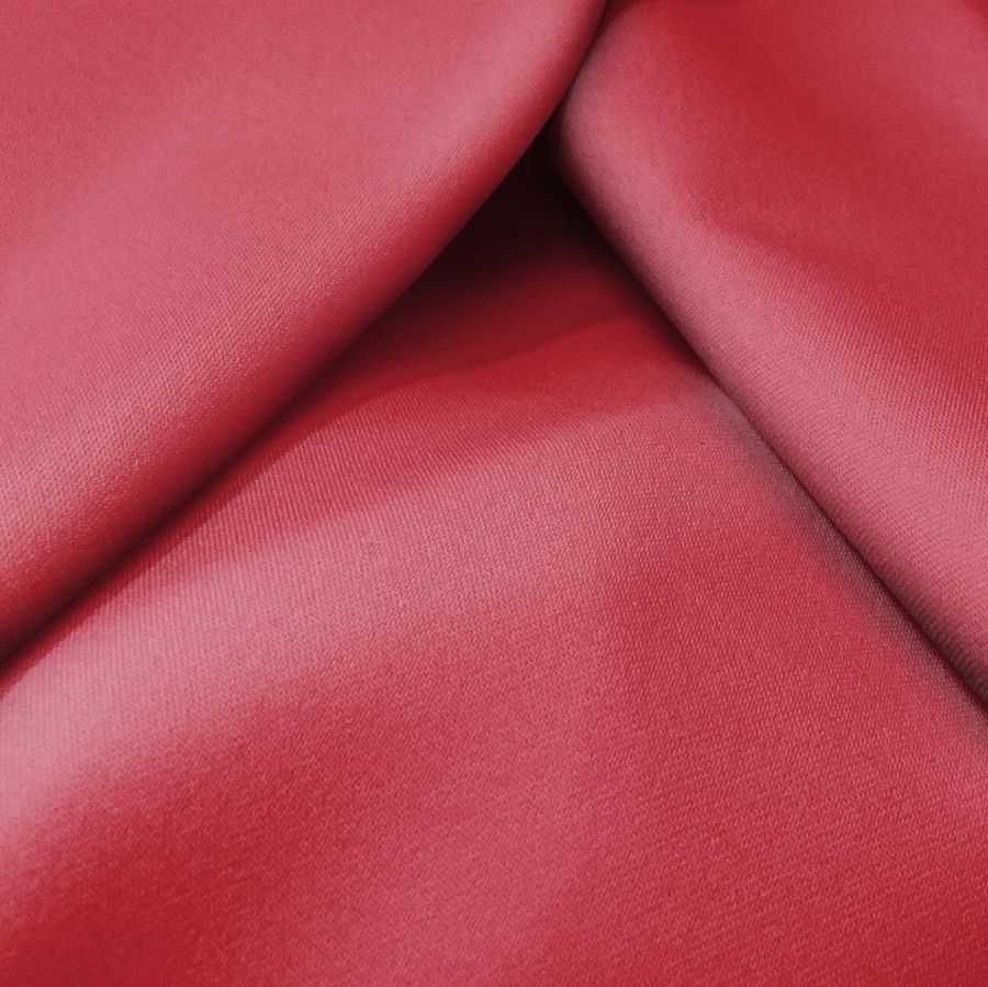La tela base de esta composición es la Sarga Bielástica - Lisboa, con un gramaje de 209 gr/m2 y un ancho de 150 cm. El color liso impreso es un Rojo Carbón cuyo CMYK es: 22 88 61 13. Este color se describe como un tono cálido y seductor, capaz de crear un ambiente acogedor y lleno de energía. Combina especialmente bien con tonos terrosos, beige, naranja, azul oscuro y tonos pastel.