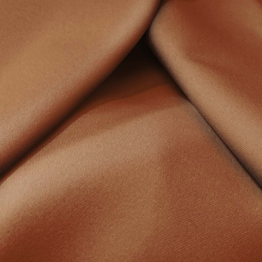 La tela base es la Sarga Bielástica - Lisboa, compuesta por un 97% de poliéster y un 3% de elastano, con un gramaje de 209 gr/m2 y un ancho de 150 cm. El color liso impreso es el Marrón Sillín Marrón, el cual tiene un CMYK de 33 67 83 38. Este color simboliza la estabilidad y la elegancia, y en términos técnicos es una combinación de tonos marrones con un toque cálido y suave. Combina perfectamente con tonos beige, gris claro y dorado.