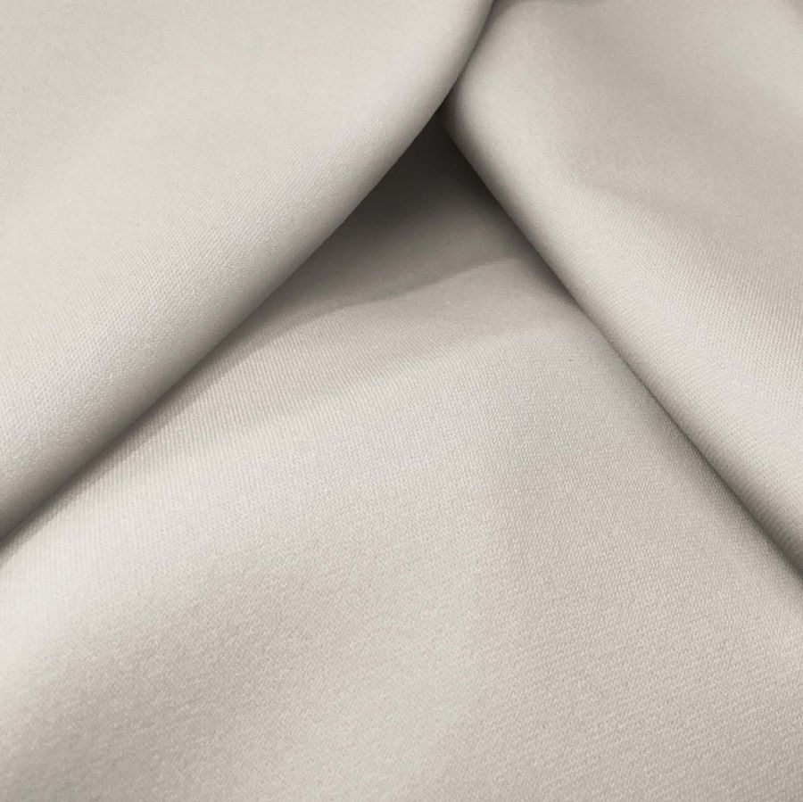 La tela base de este tejido es la Sarga Bielástica - Lisboa, compuesta por 97% POLIÉSTER y 3% ELASTANO, con un gramaje de 209 gr/m2 y un ancho de 150cm. El color liso impreso tiene una matriz CMYK de 4 9 18 0 y un tono blanco con matices de marfil suave en la impresión digital textil de una sola cara.