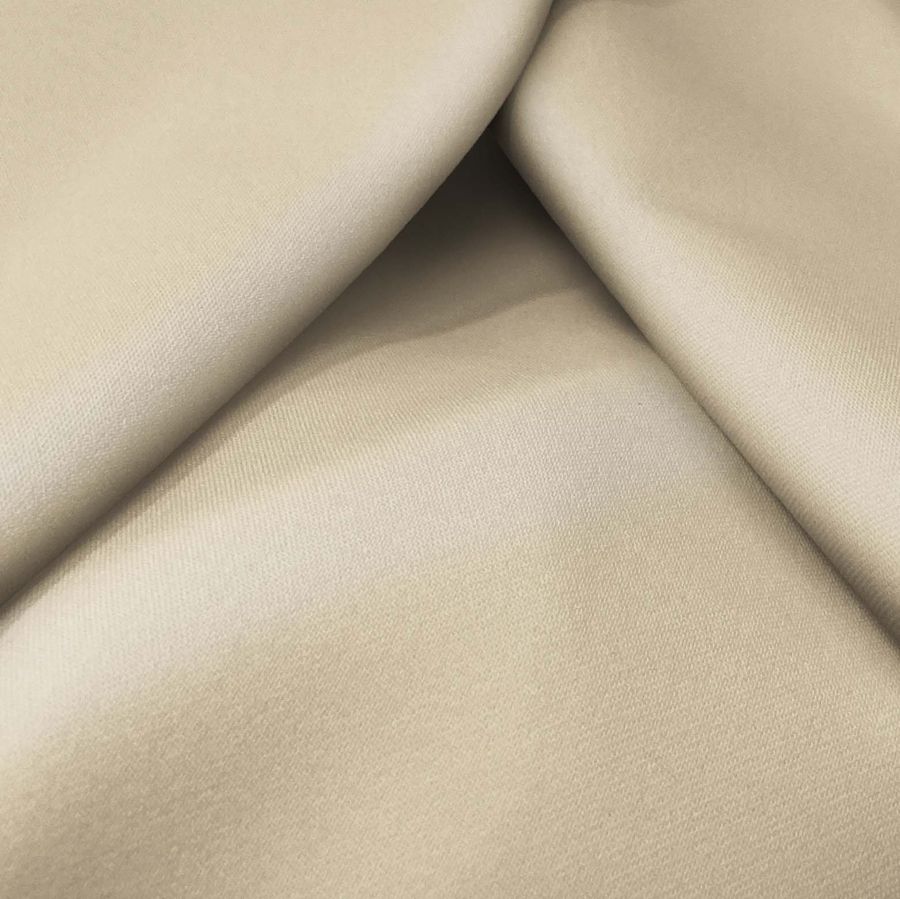 La tela base de este tejido es la Sarga Bielástica - Lisboa, compuesta en un 97% de poliéster y un 3% de elastano, con un gramaje de 209 gr/m2 y un ancho de 150 cm. El color liso impreso es una combinación de Crudo y Mocasín con el siguiente CMYK: 6 15 35 0. Este tono Mocasín destaca por su simbolismo de seguridad, estabilidad y calidez, mientras que su técnica está relacionada con la habilidad de adaptabilidad. Combina especialmente con tonos cobrizos, ocres y terracotas.