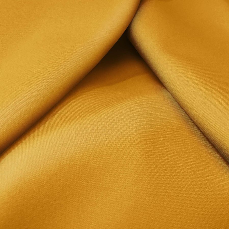 La tela base de este tejido es la Sarga Bielástica - Lisboa, compuesta principalmente por poliéster y elastano, lo que la hace resistente y elástica. El color liso impreso en esta tela es un vibrante naranja Halloween con un CMYK de 17 53 100 5. Este color es un tono cálido y llamativo que puede combinarse con otros colores como el negro, azul oscuro y verde oliva.