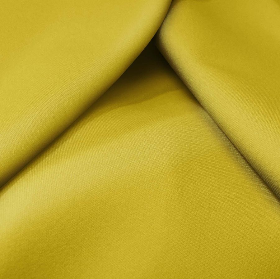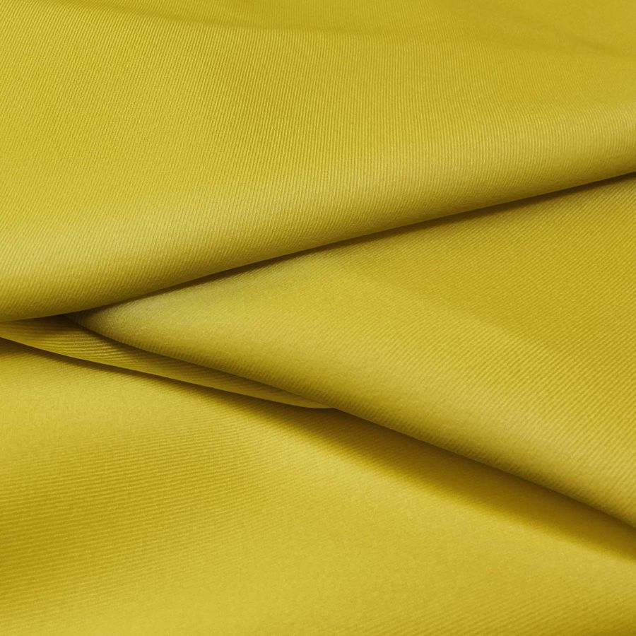 La tela base, Sarga Bielástica - Lisboa, tiene una composición de 97% poliéster y 3% elastano con un gramaje de 209 gr/m2 y un ancho de 150 cm. El color liso impreso en esta tela es Amarillo Olivo, con un CMYK de 26 30 98 10. Este color es una combinación de amarillo dorado y verde oliva, y simbólicamente se asocia con la naturaleza, la calidez y la seguridad. Combina bien con colores tierra, beige y marrón.