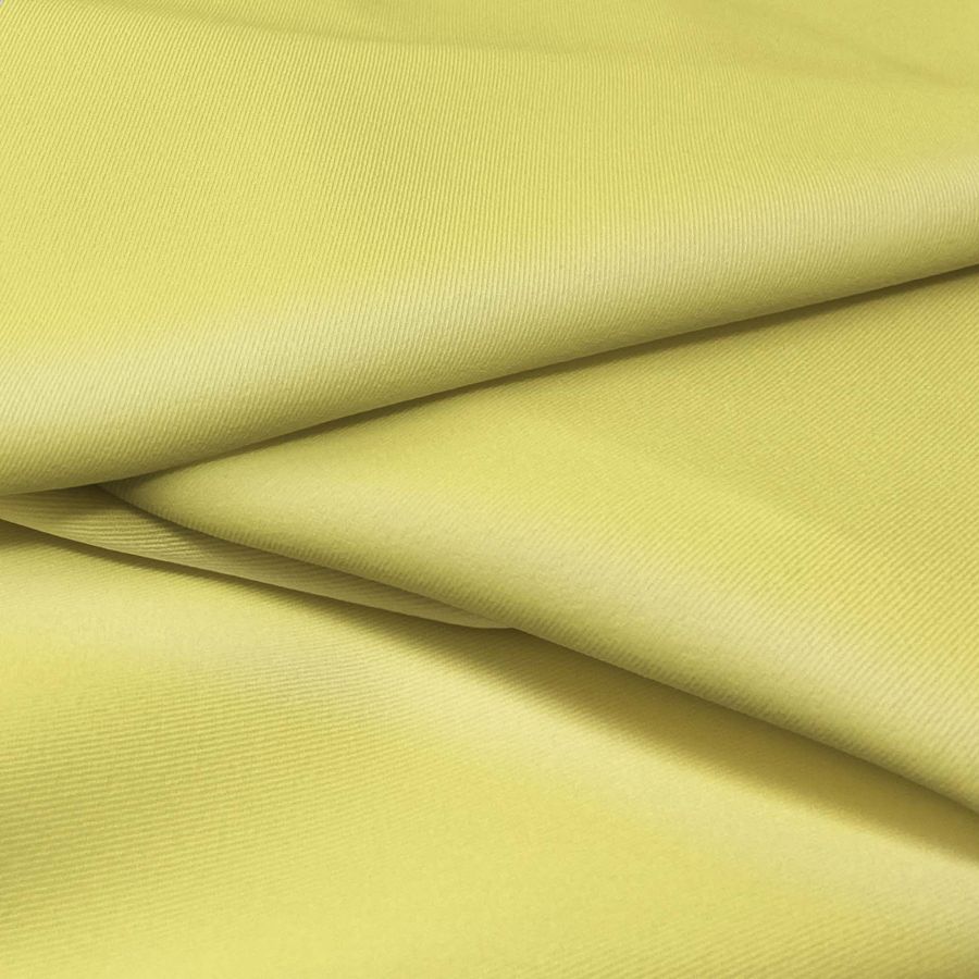 La tela base denominada Sarga Bielástica-Lisboa, compuesta por 97% poliéster y 3% elastano, es un tejido elástico con una textura suave y rugosa al tacto. El color de la tela base es blanco neutro y se combina perfectamente con el color liso impreso en amarillo maíz.
