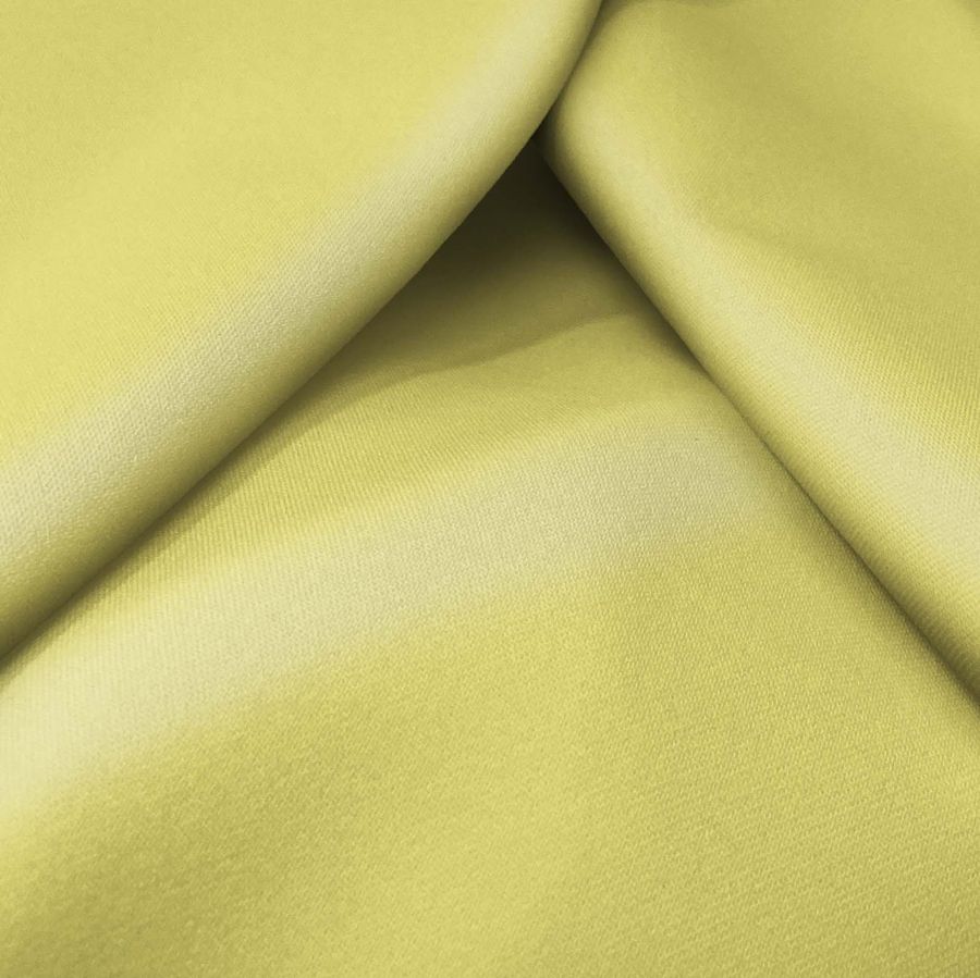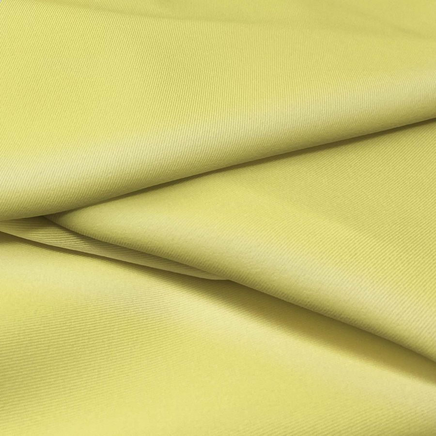 La tela base Sarga Bielástica - Lisboa presenta una composición de 97% poliéster y 3% elastano con un peso de 209 gr/m2, ofreciendo una textura suave pero elástica al tacto. El color liso impreso es un vibrante amarillo maíz con un contenido de CMYK de 4 1 65 0, lo que significa que está compuesto mayoritariamente por amarillo y en menor medida por cian y magenta. Este color combinado con otros tonos neutros como el blanco o el negro, logra un efecto armonioso y moderno.