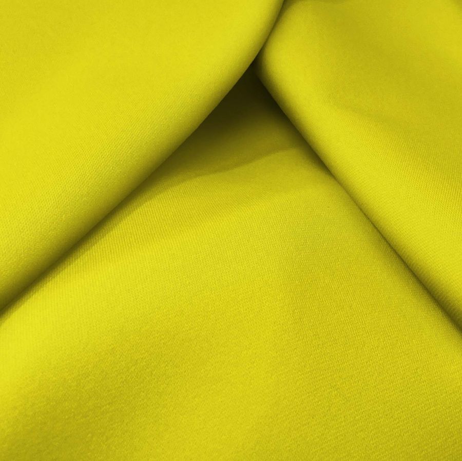 La tela base de este tejido es una Sarga Bielástica llamada Lisboa, compuesta por un 97% de poliéster y un 3% de elastano, con un gramaje de 209 gr/m2 y un ancho de 150 cm. El color liso impreso es un Amarillo Canario, que se compone de cian al 6%, amarillo al 89% y negro al 0% en el formato CMYK. Este color de tonalidad cálida y vibrante representa la alegría y la vitalidad. Combina especialmente bien con tonos neutros y oscuros como el negro, el gris y los marrones.