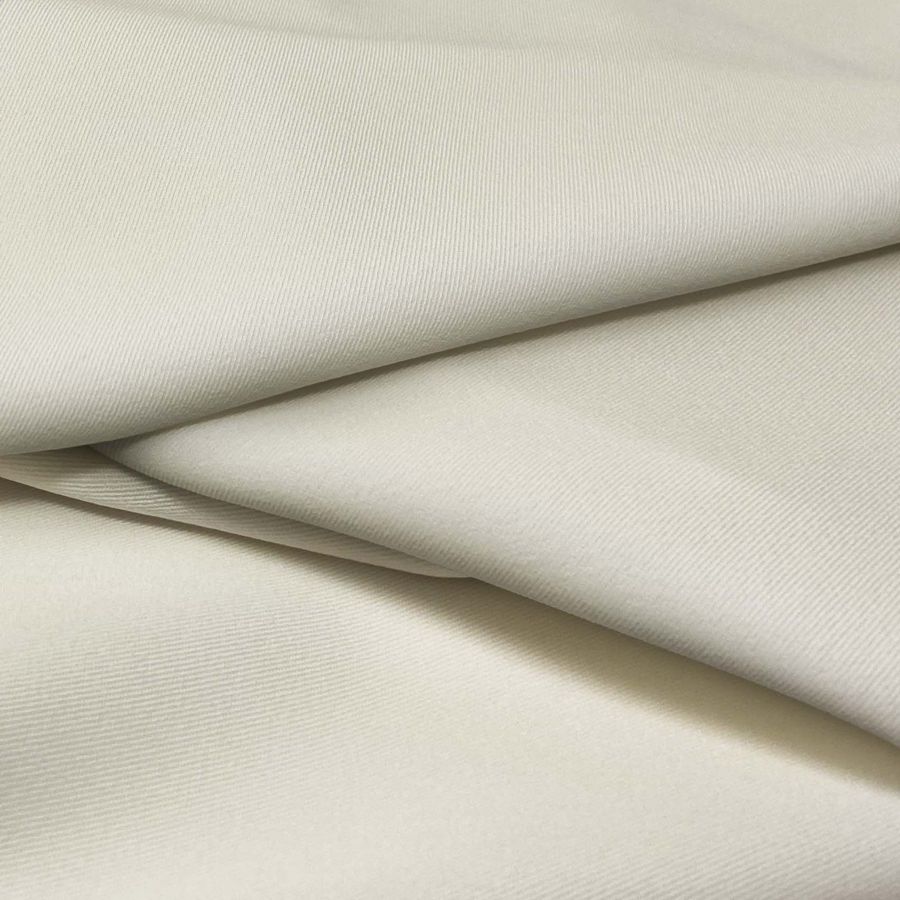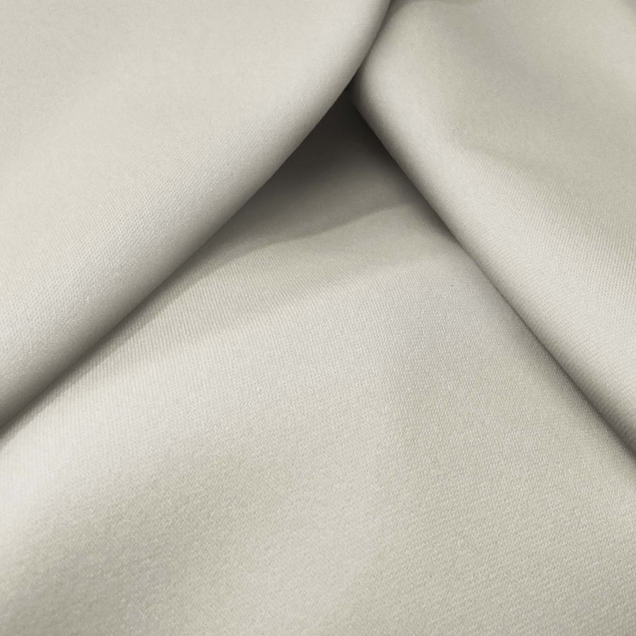 La tela base de esta prenda es la sarga bielástica - Lisboa. El color liso impreso es crudo con un matiz de marfil suave, con un CMYK de 7 7 21 0. Este color secundario tiene una mezcla equilibrada de tonos cálidos y fríos, lo que lo hace muy versátil y adecuado para una amplia gama de usos. Complementa muy bien los tonos tierra, grises y azules, lo que lo convierte en una buena opción para prendas de vestir formales e informales, así como para decoración del hogar.