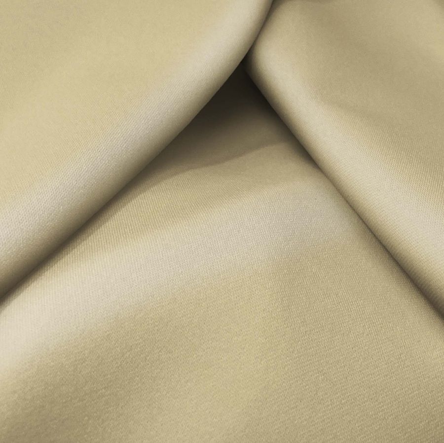 La Sarga Bielástica - Lisboa es una tela de textura rugosa, elástica y suave, compuesta por un 97% de poliéster y un 3% de elastano, con un gramaje de 209 gr/m2 y un ancho de 150 cm. El color liso impreso es Amarillo Beige Francés Claro, con un CMYK de 15 20 47 2. Este color secundario se caracteriza por su calidez, elegancia y versatilidad, combinando especialmente bien con otros tonos tierra, grises y blancos.