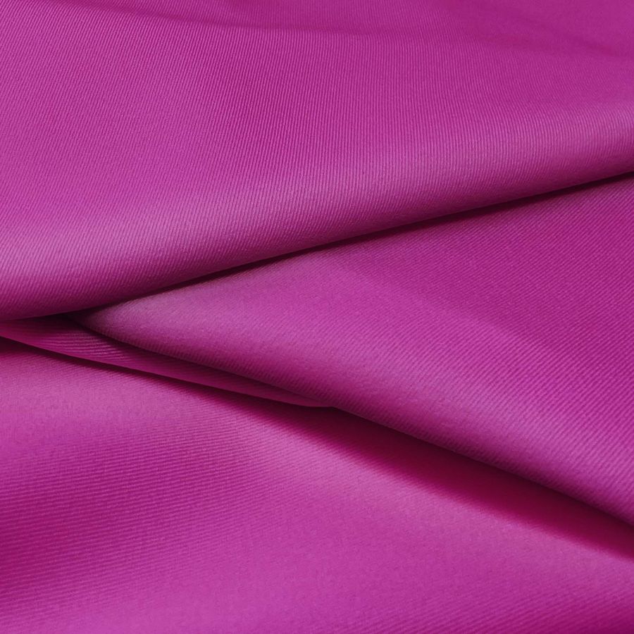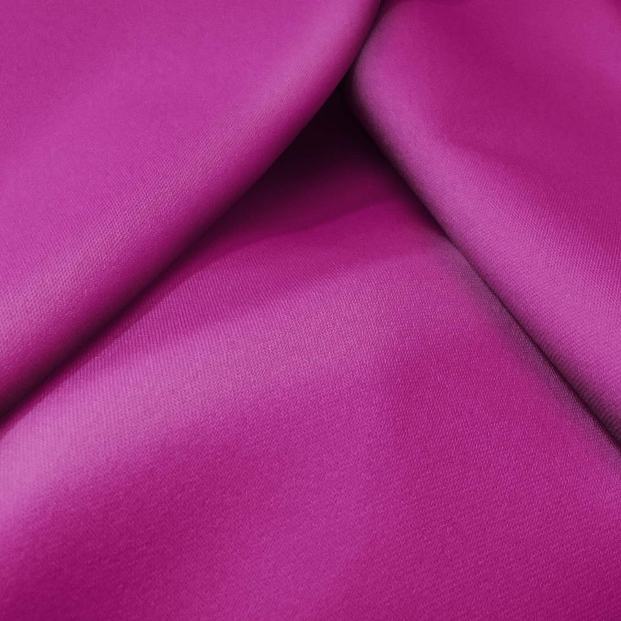 La tela base Sarga Bielástica - Lisboa, compuesta por 97% poliéster y 3% elastano, tiene un gramaje de 209 gr/m2 y un ancho de 150 cm. Su color liso impreso, Terciopelo Ciruela, tiene los atributos siguientes: Cyan 44, Magenta 100, Yellow 11 y Black 4 en el modelo de impresión CMYK. Este color morado combina perfectamente con otros colores como el verde musgo, el tono tierra o el plateado, creando combinaciones armoniosas y sofisticadas. La tela está impresa con el color liso a una sola cara por impresión digital textil, lo que significa que no es un tejido tintado sino impreso por una sola cara.