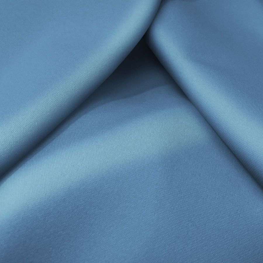 La tela base es una sarga bielástica llamada Lisboa, compuesta por un 97% de poliéster y un 3% de elastano, con un gramaje de 209 gr/m2 y un ancho de 150 cm. El color liso impreso es un azul steelblue, cuyo CMYK es 67 39 15 2. Este color se caracteriza por ser elegante, sofisticado y moderno, transmitiendo una sensación de confianza y fuerza. Además, se combina perfectamente con tonos como el blanco, gris y amarillo. Cabe destacar que la tela está impresa con el color liso a una sola cara por impresión digital textil.