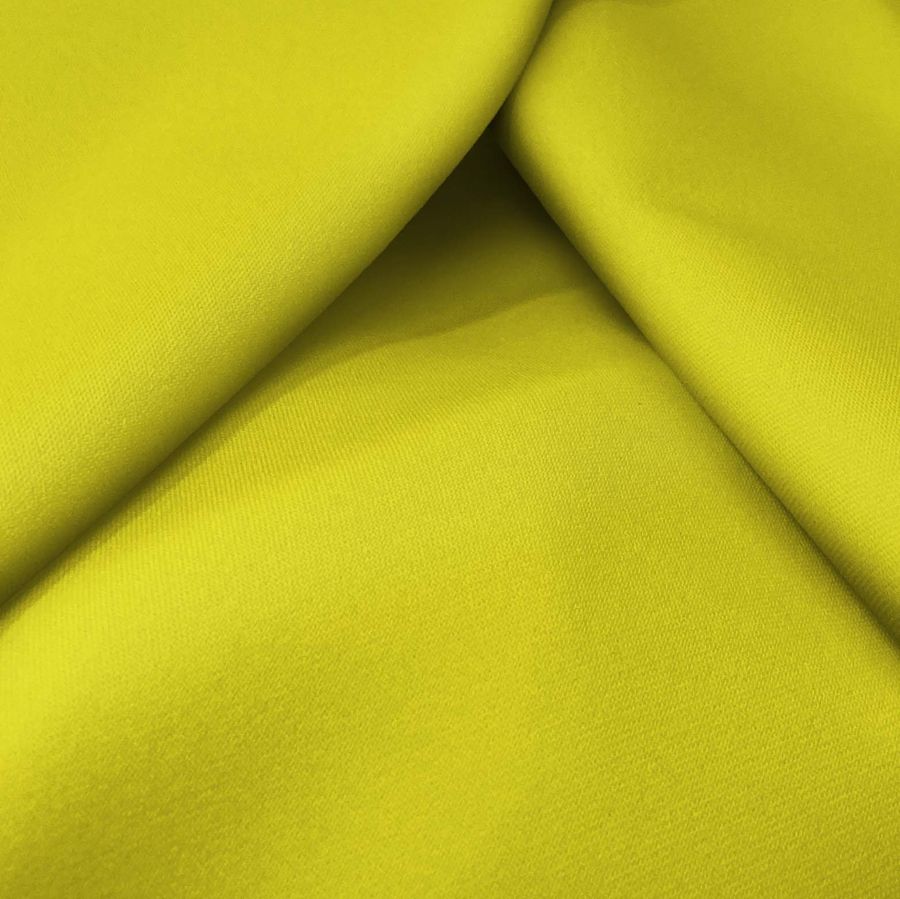 La tela base es la Sarga Bielástica - Lisboa, compuesta por un 97% de poliéster y un 3% de elastano, con un gramaje de 209 gr/m2 y un ancho de 150 cm. El color liso impreso es Amarillo Canario, con un CMYK de 14 4 90 0, lo que indica una intensidad de color alto en el tono amarillo con una mezcla de magenta y cian mínima. Este color secundario aporta calidez y luminosidad a la tela, es complementario con el color morado y combina bien con tonos verdes y azules oscuros.