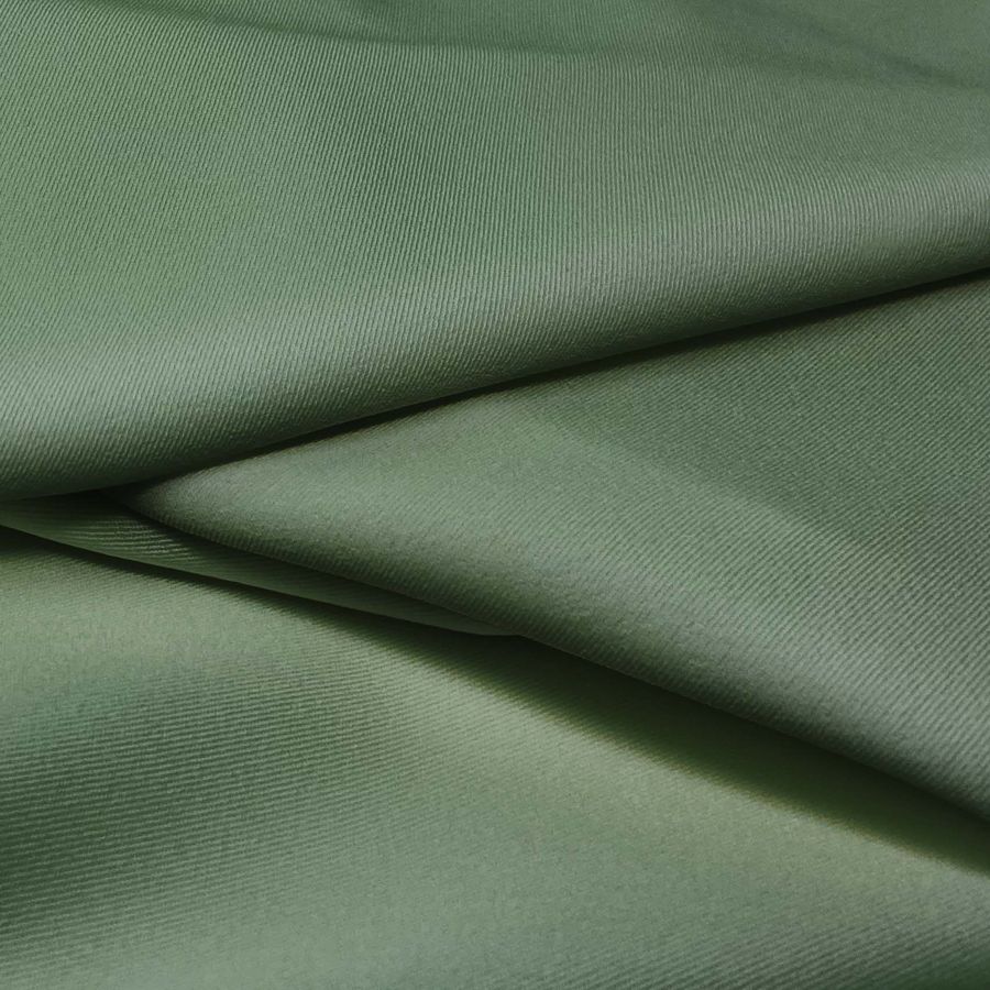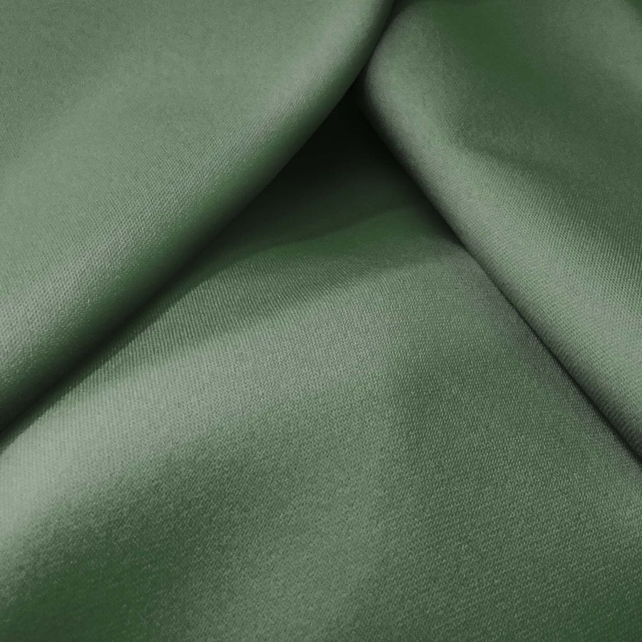 La tela base de esta prenda es la Sarga Bielástica - Lisboa, compuesta por un 97% de poliéster y un 3% de elastano, con un gramaje de 209 gr/m2 y un ancho de 150 cm. El color liso impreso es un verde oscuro, cuyo CMYK es 69 42 70 37, que combina perfectamente con tonos como el blanco, el marfil, el beige o el gris. Es importante destacar que la tela está impresa con el color liso a una sola cara por impresión digital textil.
