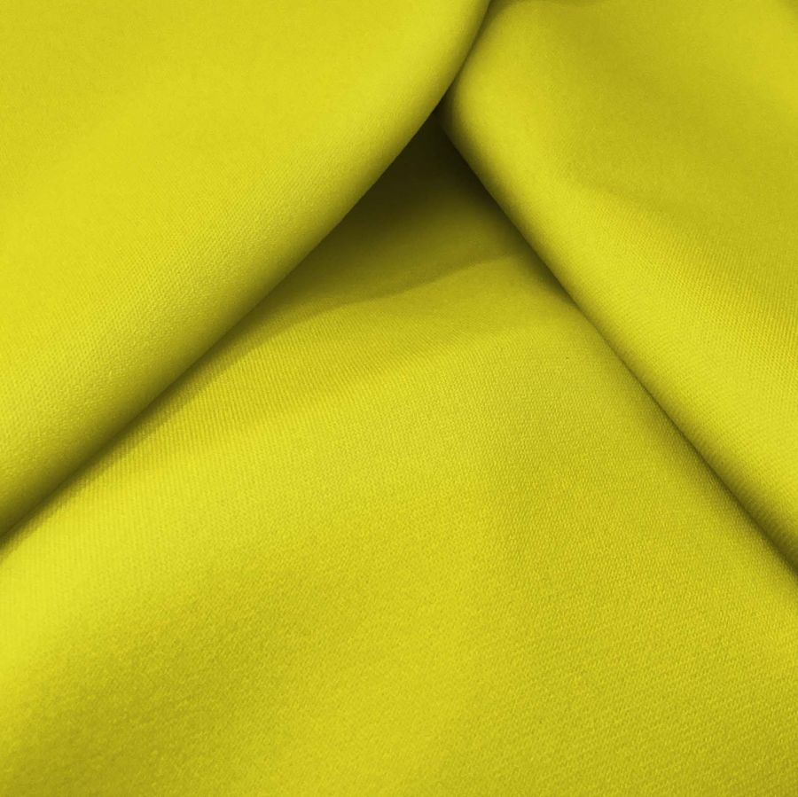 La tela base de este tejido es la Sarga Bielástica - Lisboa, compuesta por un 97% de poliéster y un 3% de elastano, con un gramaje de 209 gr/m2 y un ancho de 150 cm. El color liso impreso es Amarillo Canario, con una combinación de tintas CMYK de 10 0 89 0. Además, presenta una textura rugosa, elástica y suave al tacto. Este color combina especialmente bien con tonos tierra, naranja y rojo.