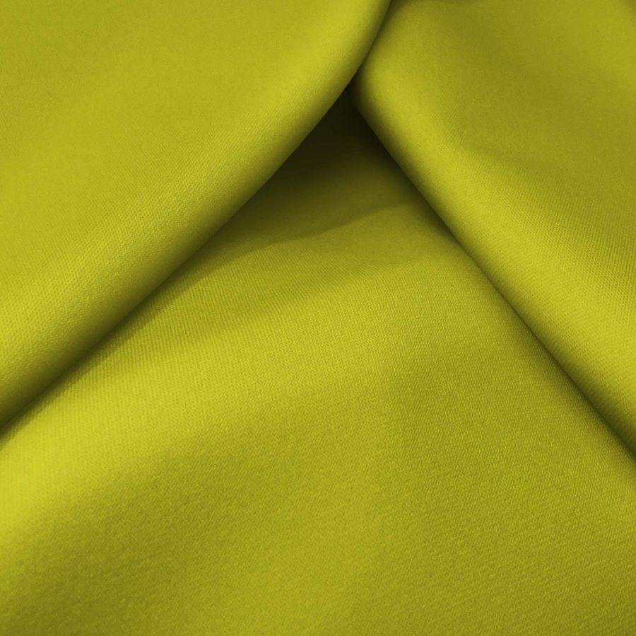 La tela base es la Sarga Bielástica - Lisboa, compuesta por 97% Poliéster y 3% Elastano, con un gramaje de 209 gr/m2 y un ancho de tela de 150cm. Su color liso impreso es un vibrante verde olivo con un CMYK de 36 20 98 5, el cual se puede combinar perfectamente con tonalidades beige y marrones. Es importante destacar que esta tela está impresa con el color liso a una sola cara por impresión digital textil.