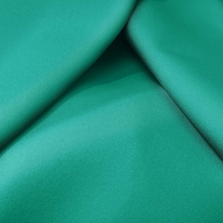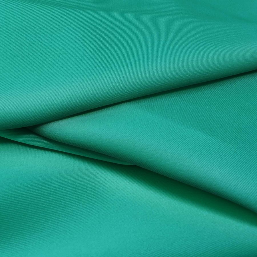 La tela base de este tejido es una Sarga Bielástica-Lisboa, compuesta por un 97% de poliéster y un 3% de elastano, con un gramaje de 209 gr/m2 y un ancho de 150 cm. El color liso impreso es un verde menta oscuro, con un CMYK de 83 21 60 5. Este color se caracteriza por su frescura, armonía y elegancia, y combina perfectamente con tonalidades claras como el blanco y el beige, o con colores intensos como el rosa y el morado.