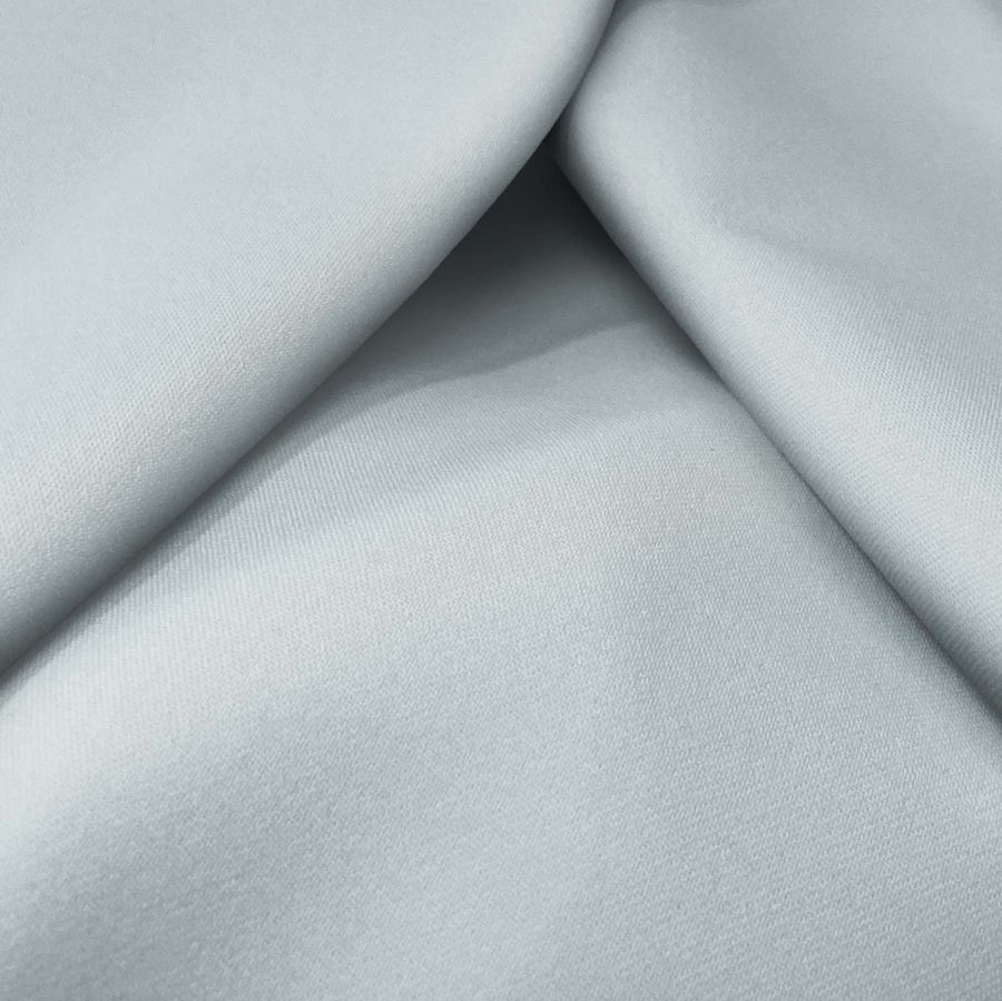La tela base, Sarga Bielástica - Lisboa, tiene una composición de 97% poliéster y 3% elastano con un gramaje de 209 gr/m2 y un ancho de 150 cm. El color liso impreso es de tonalidad Powder Blue, con un CMYK de 23 4 10 0 y una textura suave y elástica. Este color simboliza calma, tranquilidad y frescura, y combina bien con tonos claros como el blanco y el rosa.
