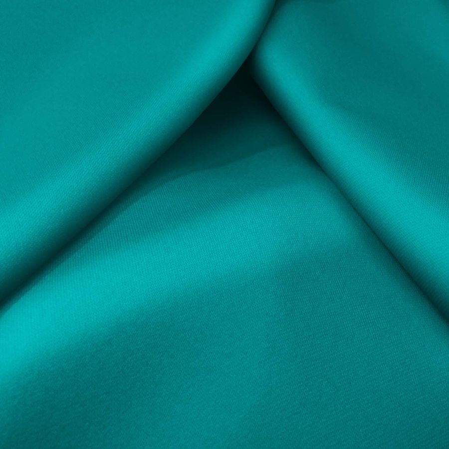 La tela base de este tejido es la Sarga Bielástica - Lisboa, compuesta principalmente por un 97% de poliéster y un 3% de elastano, con un gramaje de 209 gr/m2 y un ancho de 150 cm. El color liso impreso es un verde azulado con un CMYK de 82 25 45 8, lo que le da un acabado fresco y moderno. Este color combina bien con tonos neutros como el blanco y el gris, así como con otros tonos de verdes y azules.