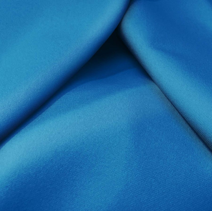 La tela base de este tejido es la Sarga Bielástica - Lisboa, compuesta por un 97% de poliéster y un 3% de elastano, con un gramaje de 209 gr/m2 y un ancho de 150 cm. El color liso impreso es un tono de azul intenso, con un CMYK de 92% de Cyan, 57% de Magenta, 13% de Yellow y 2% de Black. Este color simboliza la estabilidad y la serenidad, siendo un color muy utilizado en moda y decoración por su versatilidad. Combina especialmente bien con tonos claros como el blanco y el gris, así como con tonos más oscuros como el negro o el marrón.