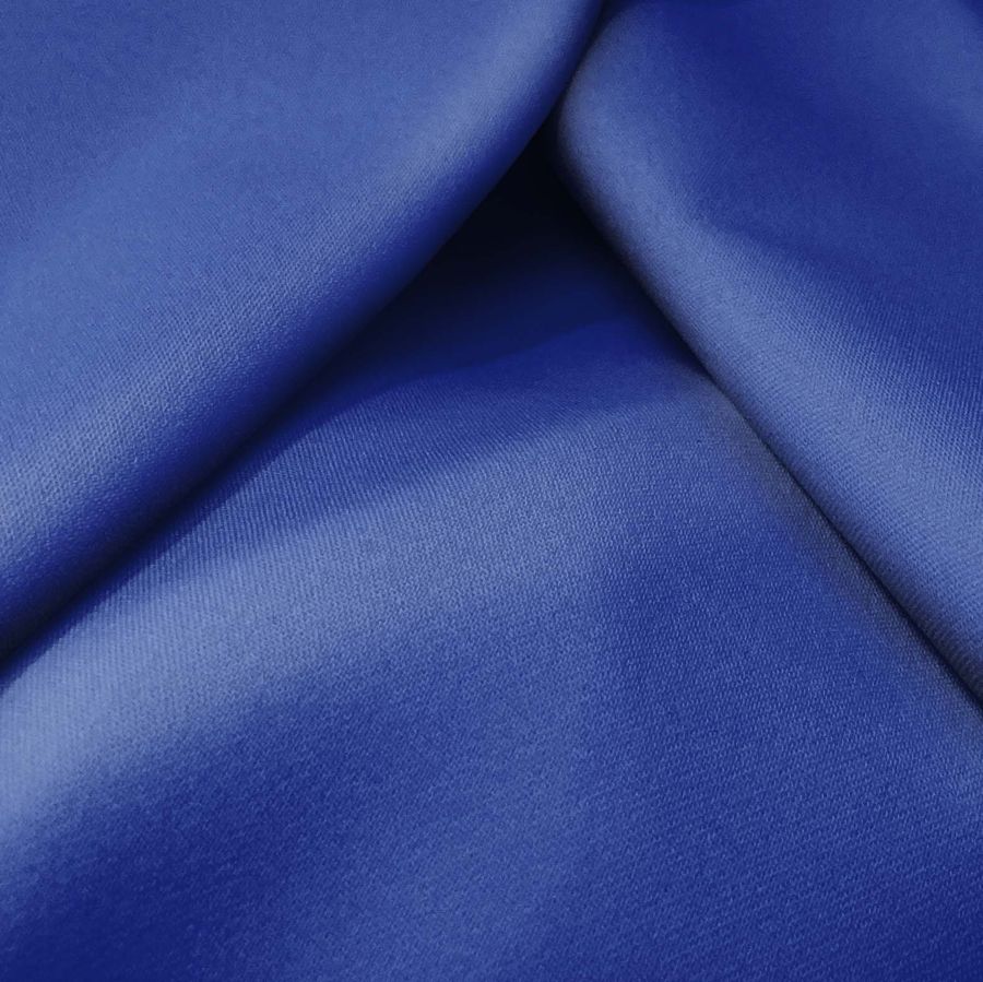 La tela base, Sarga Bielástica - Lisboa, tiene una composición del 97% de poliéster y un 3% de elastano, lo que la convierte en una tela elástica, rugosa al tacto y suave al mismo tiempo. El color liso impreso es un hermoso tono azul marino, que se obtiene con la mezcla de tinta Cyan (100), Magenta (87), Yellow (12) y Black (1) con un CMYK de 100, 87, 12, 1. Este profundo color azul combina perfectamente con tonos tierra, blancos, grises, nudes y pastel.
