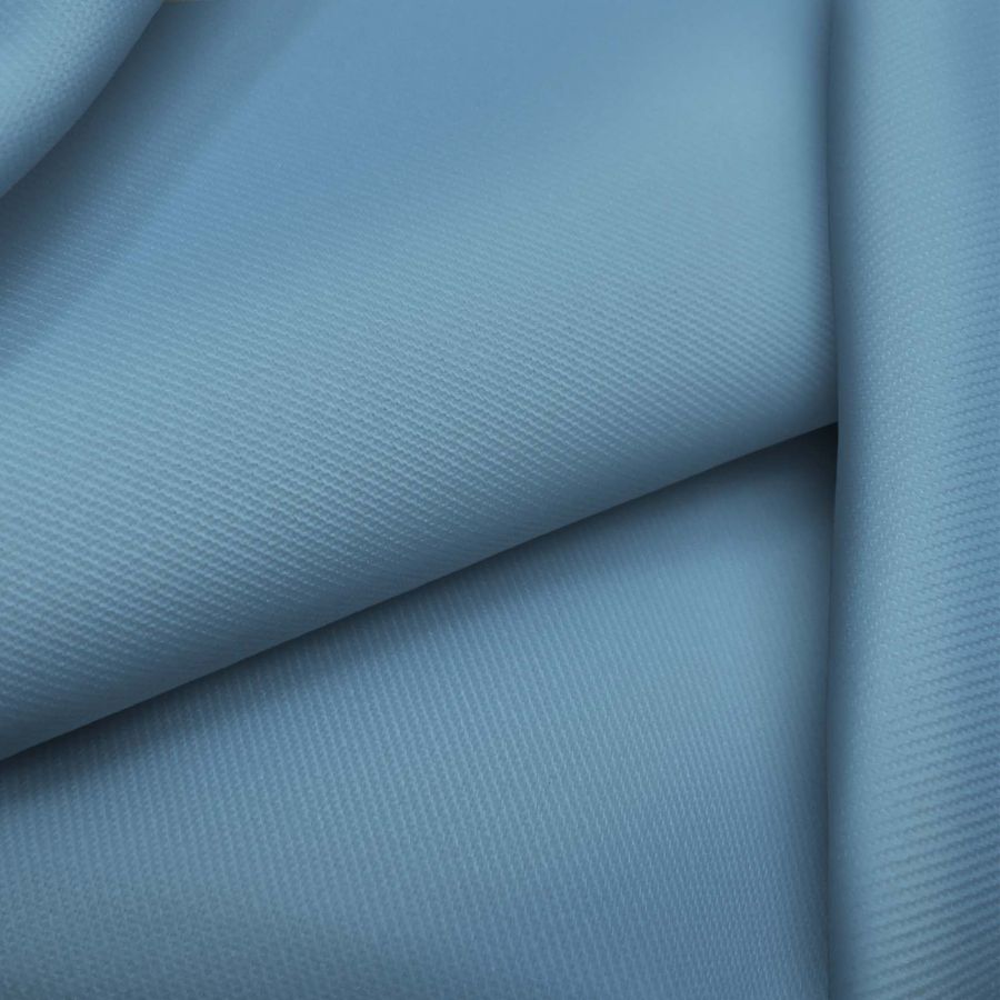 La tela base es una sarga de poliéster con un 4% de elastano, de un gramaje de 220 gr/m2 y un ancho de 150 cm, que se presenta en un color liso impreso de un llamativo tono azul koi. El CMYK del color liso indicado es de 63 32 18 3, y su combinación de cian, magenta, amarillo y negro le proporciona una tonalidad fuerte y vibrante.