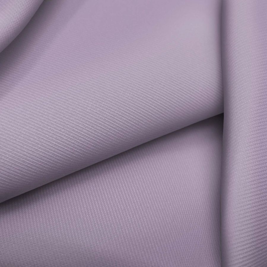 La tela base es una sarga de poliéster y elastano de 220 gr/m2 y 150 cm de ancho, con una composición de 96% poliéster y 4% elastano. El color liso impreso es un morado-lavanda púrpura con una combinación CMYK de 35 41 13 1. Es importante mencionar que el tejido está impreso a una sola cara por impresión digital textil.