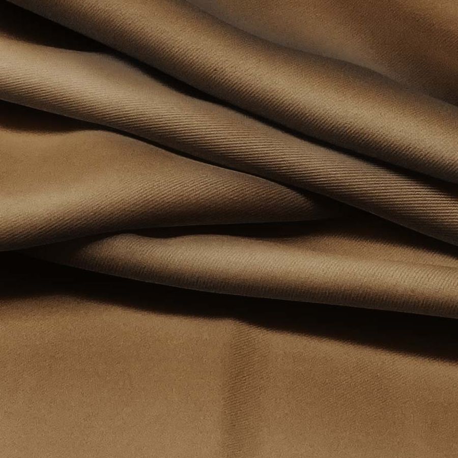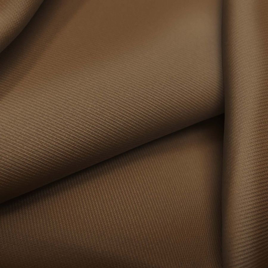 La tela base es una sarga de poliéster y elastano, con un gramaje de 220 gr/m2 y una anchura de 150 cm. Su color liso impreso es marrón chocolate con leche, con un CMYK de 44 61 82 59. El color secundario es evocador y cálido, creando una atmósfera sofisticada y acogedora. Combina especialmente con tonos neutros como beige, topo o blanco, así como con tonos tierra como ocre o terracota. El tejido está impreso con el color liso a una sola cara por impresión digital textil, lo que significa que el color solo está presente por una de las caras del tejido.
