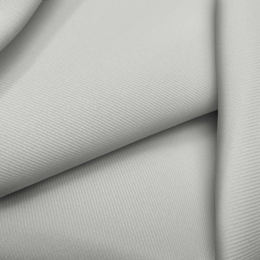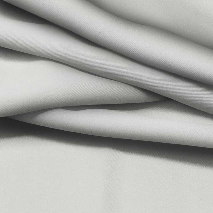 La tela base es una sarga de composición 96% poliéster y 4% elastano, con un gramaje de 220 gr/m2 y un ancho de 150 cm. Presenta una textura suave y delgada al tacto, ideal para la confección de prendas de moda como camisas, faldas, blusas, vestidos y pañuelos. El tejido está impreso en color liso a una sola cara por impresión digital textil, con un CMYK de 17 11 15 0 que produce un color gris plata platino, que se combina especialmente con tonos azules y verdes.