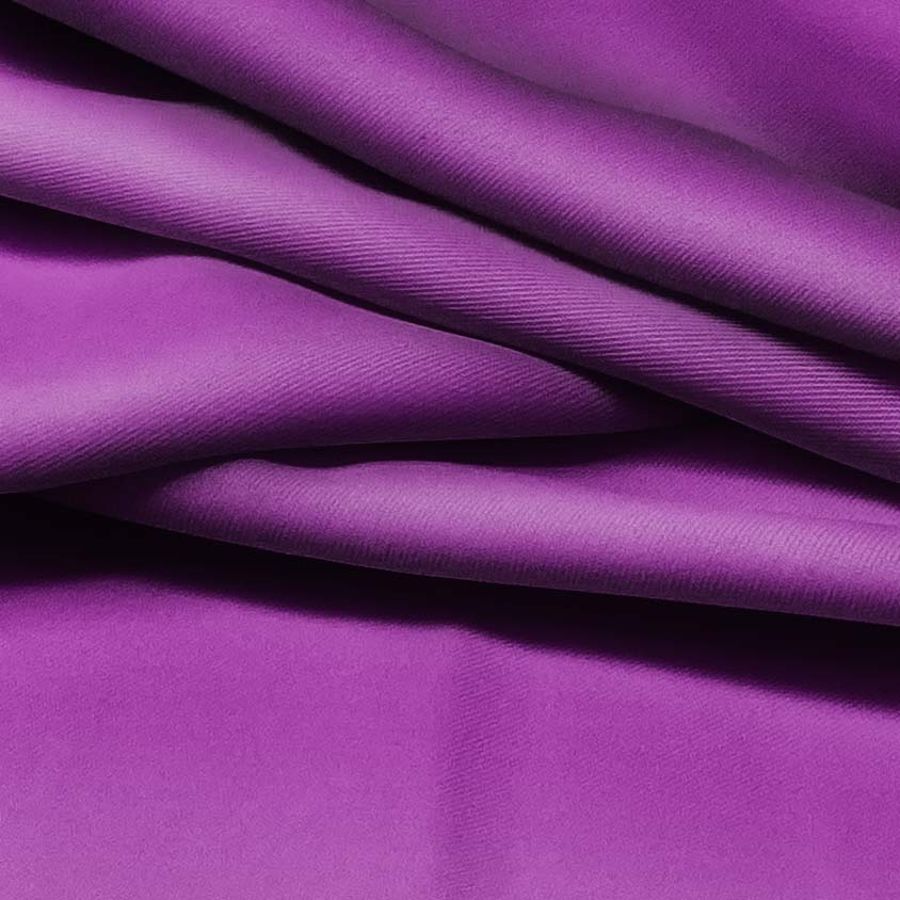 La tela base, Sarga - Prada, es una sarga de 96% poliéster y 4% elastano, con un gramaje de 220 gr/m2 y 150 cm de ancho. El color liso impreso, Morado/Púrpura, tiene una composición de CMYK de 65 98 9 2. Este color simboliza la creatividad, la sofisticación y el lujo, y se combina particularmente bien con tonos grises y rosados.