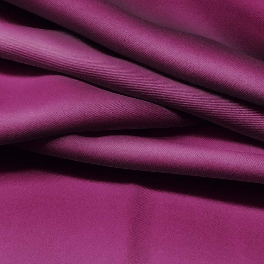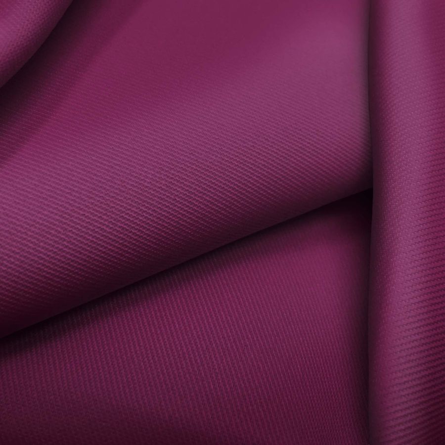 La tela base es Sarga - Prada, con composición de 96% poliéster y 4% elastano, tiene un gramaje de 220 gr/m2 y un ancho de 150 cm. El color liso impreso es de un hermoso tono morado berenjena con CMYK de 49 100 31 47. Un color secundario fuerte que simboliza la creatividad, elegancia y extravagancia. Este color combina muy bien con los tonos rosa, beige y gris, creando un contraste armónico. La tela está impresa a una sola cara por impresión digital textil.