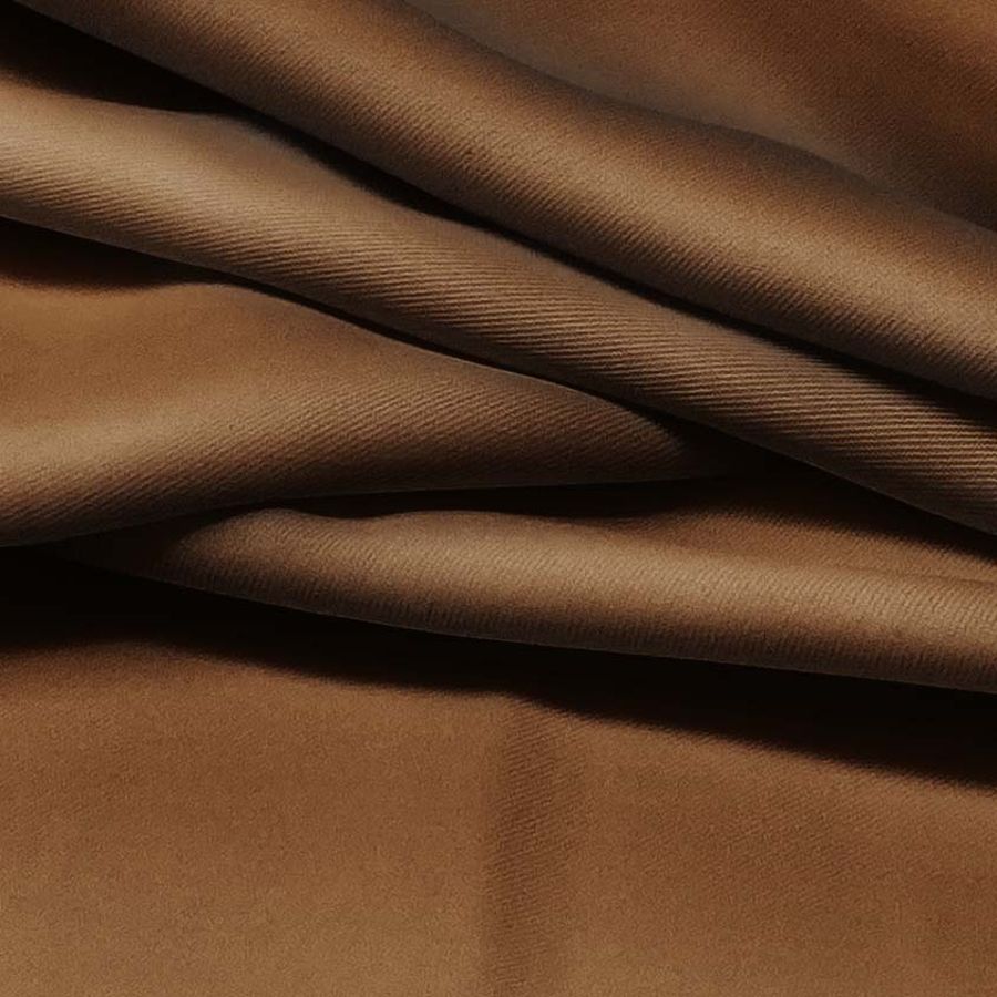 La tela base es una sarga Prada, compuesta por un 96% de poliéster y un 4% de elastano, con un peso de 220 gr/m2 y un ancho de 150 cm. El color liso impreso es marrón oscuro, con un CMYK de 43 70 91 64. Este color es simbólico de elegancia, estabilidad y seguridad. Combinado con tonos claros como el beige o el gris, o colores fuertes como el rojo, crea una atmósfera sofisticada y moderna. La tela está impresa a una sola cara por impresión digital textil.