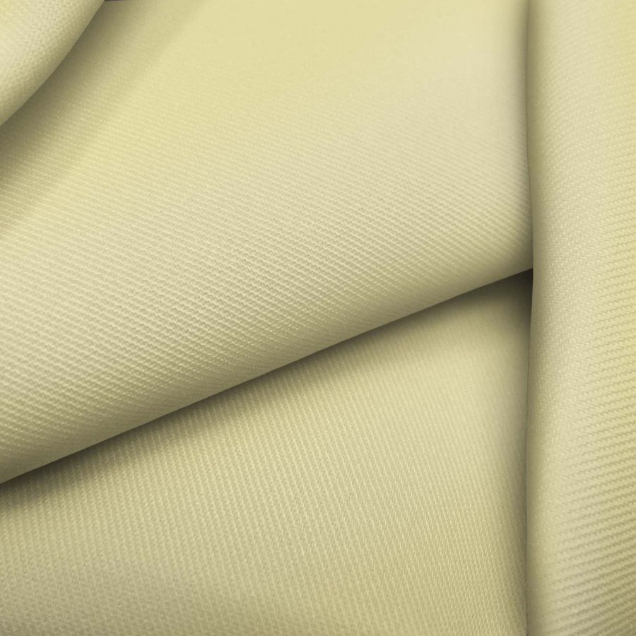 La tela base es una sarga de 220 gr/m2 compuesta por 96% poliéster y 4% elastano, con un ancho de 150 cm. El color liso impreso es un tono amarillo maíz, con una mezcla de tinta cyan de 4, magenta de 3, yellow de 42 y black de 0, expresado en CMYK de 4 3 42 0. Este color es suave al tacto y su textura es delgada.