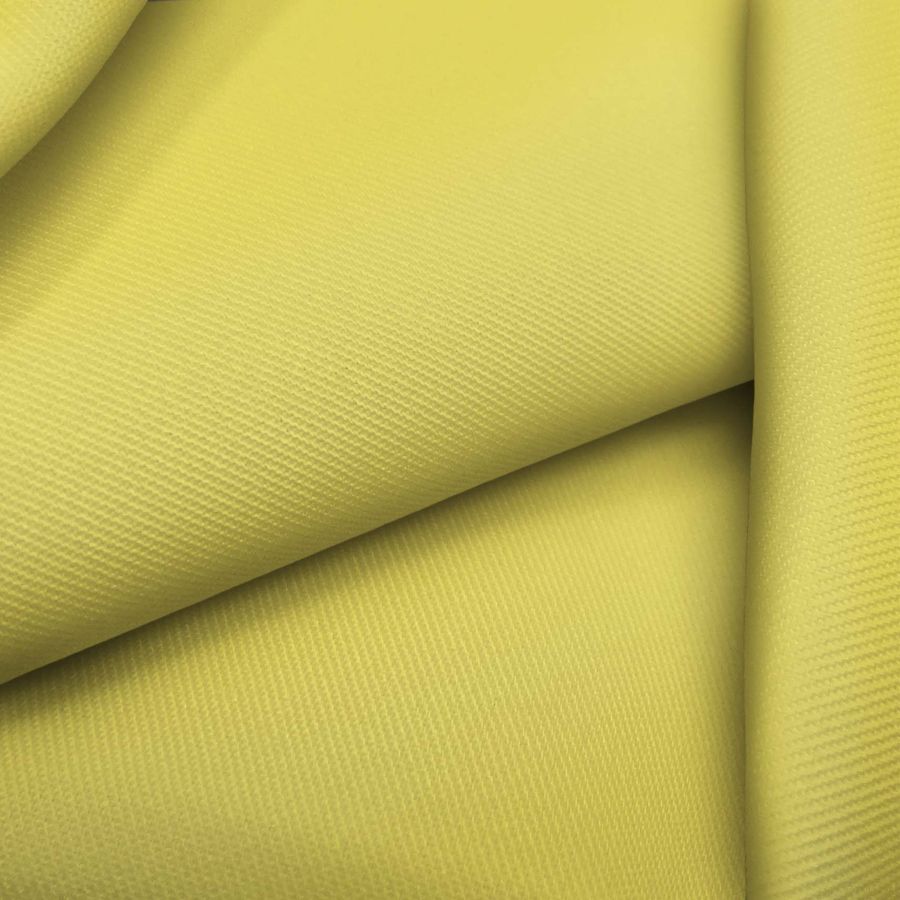 La tela base es una sarga de poliéster y elastano con un gramaje de 220 gr/m2 y un ancho de 150 cm. Se presenta en color liso amarillo maíz, cuya tinta CMYK indica un bajo nivel de cian y magenta y un alto nivel de amarillo, creando un tono cercano al color del maíz dulce. Este color secundario se asocia con sentimientos de felicidad, energía y optimismo. Combina bien con tonos de verde, rosa y morado.
